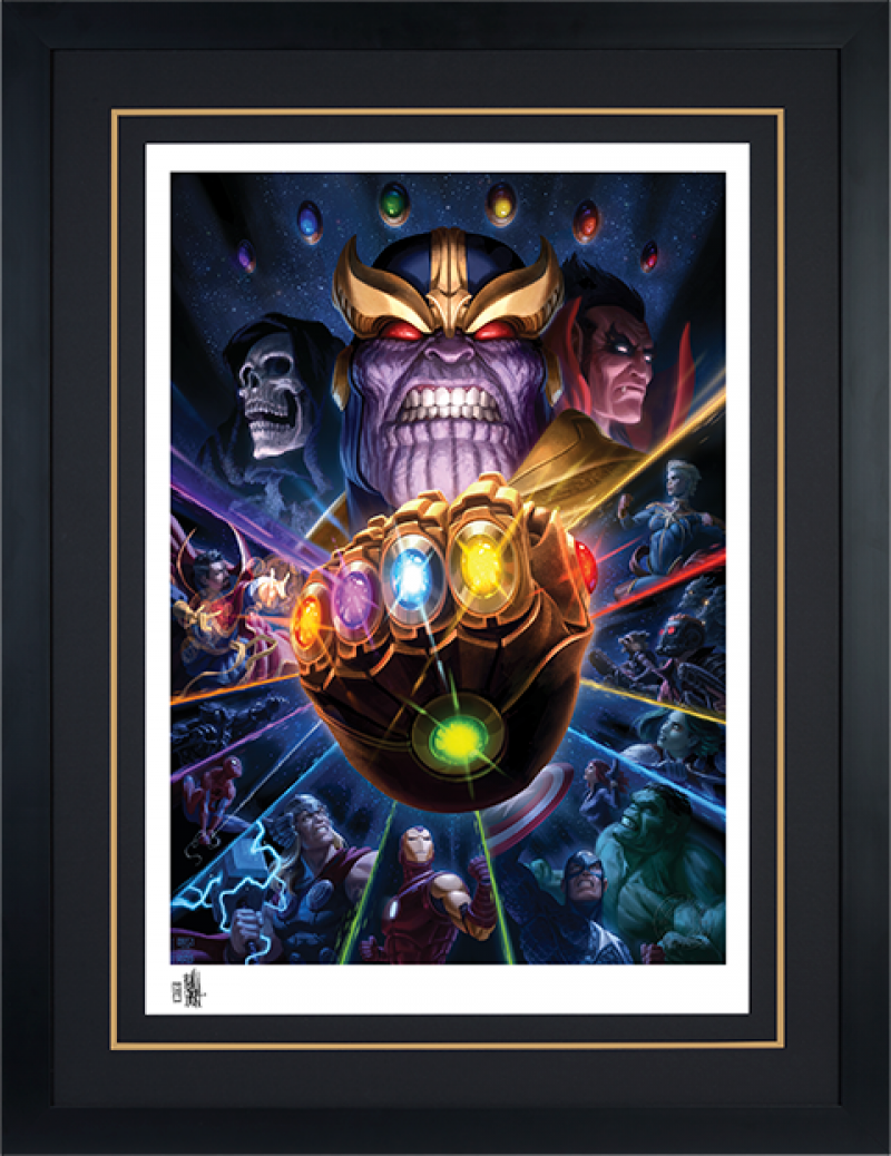 The Thanos & Infinity Gauntlet Fine Art Print by Fabian Schlaga features an authorized, automated artist signature and an embossed Seal of Authenticity as a part of the limited edition of 500 pieces. This fine art collectible is a must-have for Marvel fans of every generation!