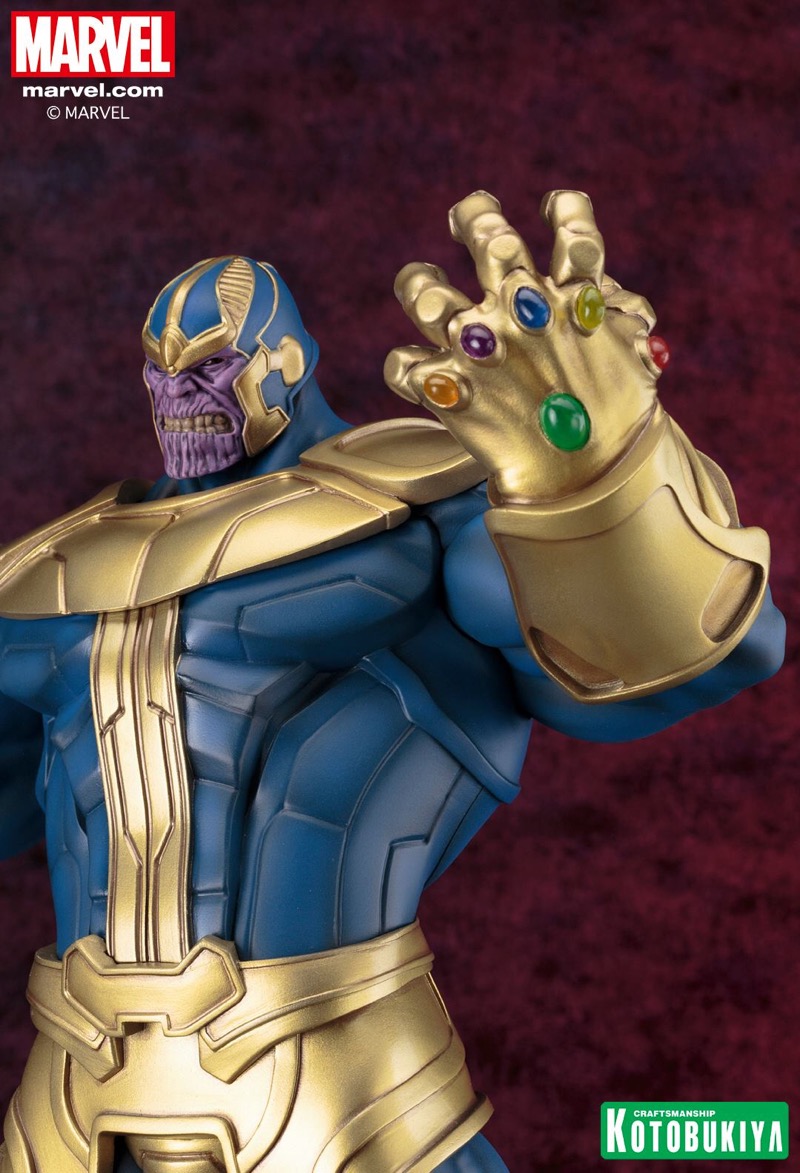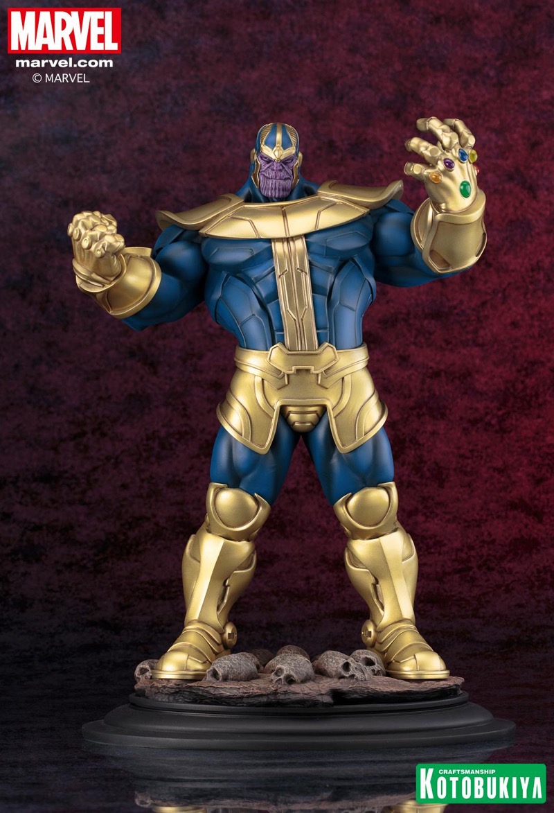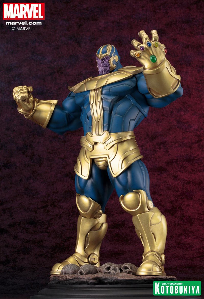 A Kotobukiya Japanese import! While the last series of Marvel Universe Fine Art Statues from Kotobukiya focused on the heroes and villains of the X-Men, the next character comes from outer space and has plans to rule the entire universe: THANOS! Known as the “Mad Titan,” Thanos is a massively powerful alien who first appeared in the pages of Marvel Comics back in 1973 and has been a menace ever since. An Eternal and Deviant as well as a brilliant scientist, the purple villain became obsessed with Mistress Death and sought to please her by killing. Over the years Thanos would use various weapons and tools in his quest for Death, but by far the most famous and destructive is of course the Infinity Gauntlet, an all-powerful relic combining the powers of six Infinity Gems. With his popularity reaching new heights thanks to his appearance in the Marvel Cinematic Universe, Thanos is the perfect new addition to the Fine Art Statue lineup.