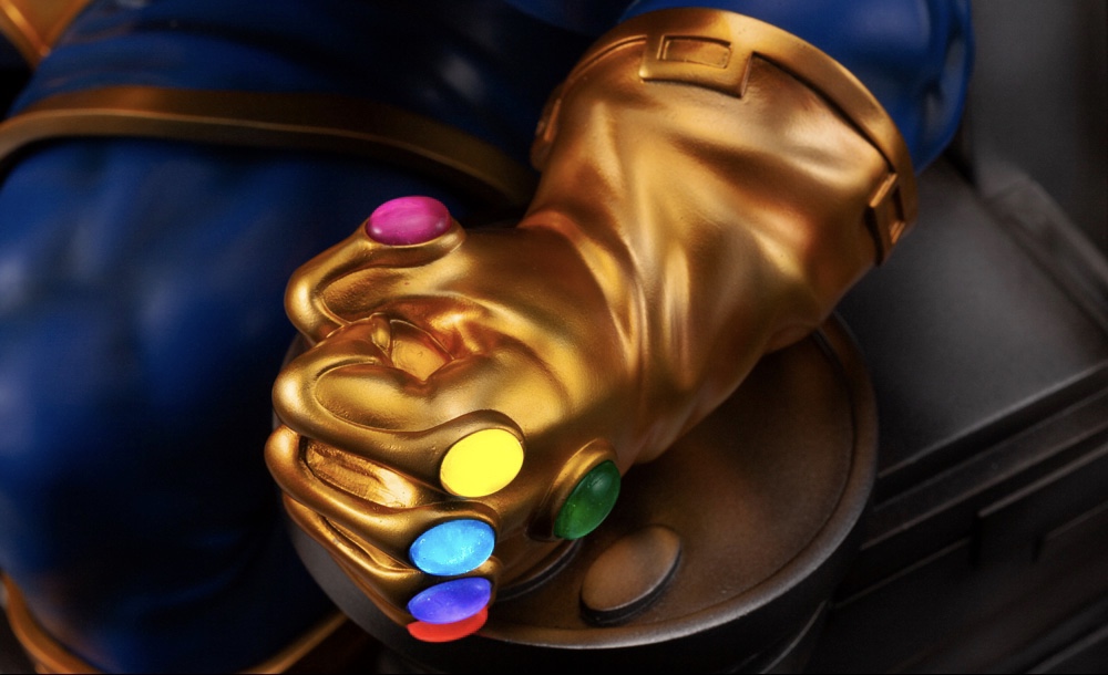 The realism that can be seen in the sculpt of THANOS, from the way he looks down at inferior beings from atop his throne, to the the optical illusion of his eyes always keeping watch, this statue gives off an evil and almost frightening vibe. The button to turn LED lights inside of THANOS’ eyes and Infinity Gems are inside of the statue and can be accessed by removing the INFINITY GAUNTLET and head.