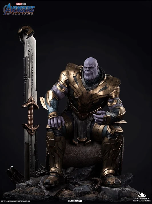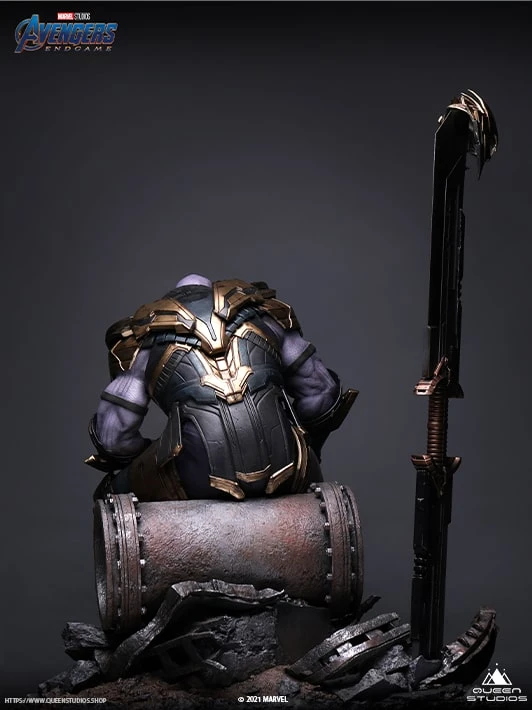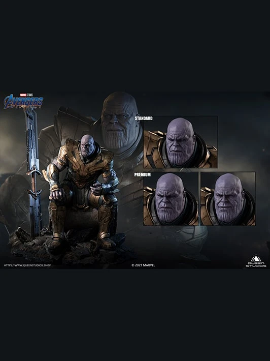 The Queen Studios 1/4 Thanos statue is based on the Thanos we saw in Avengers Endgame. Expertly crafted and intricately detailed, this limited edition collectible features two head sculpts inspired by the 2019 hit movie. The first head sculpt features Thanos looking deep in thought with a serious expression. While the second head sculpt features the Mad Titan with a wry smile.