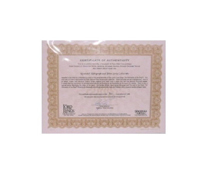 Included in this Fine Art Collectible is a piece of the actual film strip of The Lord of the Rings: The Fellowship of the Ring. The strip was cut from a reel donated by Peter Jackson from his personal collection. These film strips are not a reproduction. Each is an actual, unique, and individual Cinema Scope negative print taken from a single