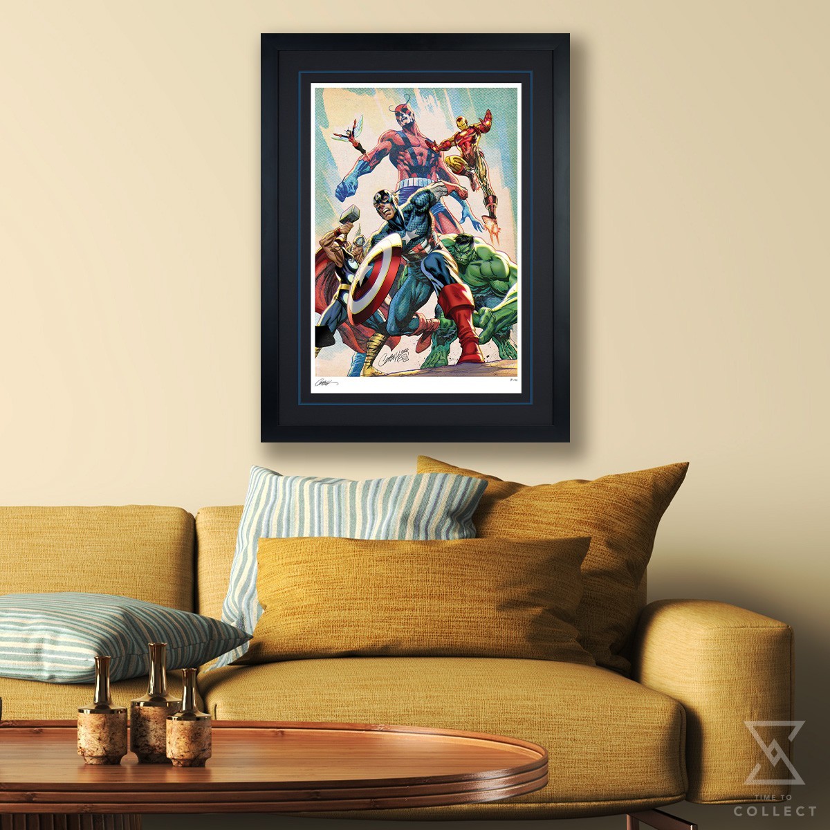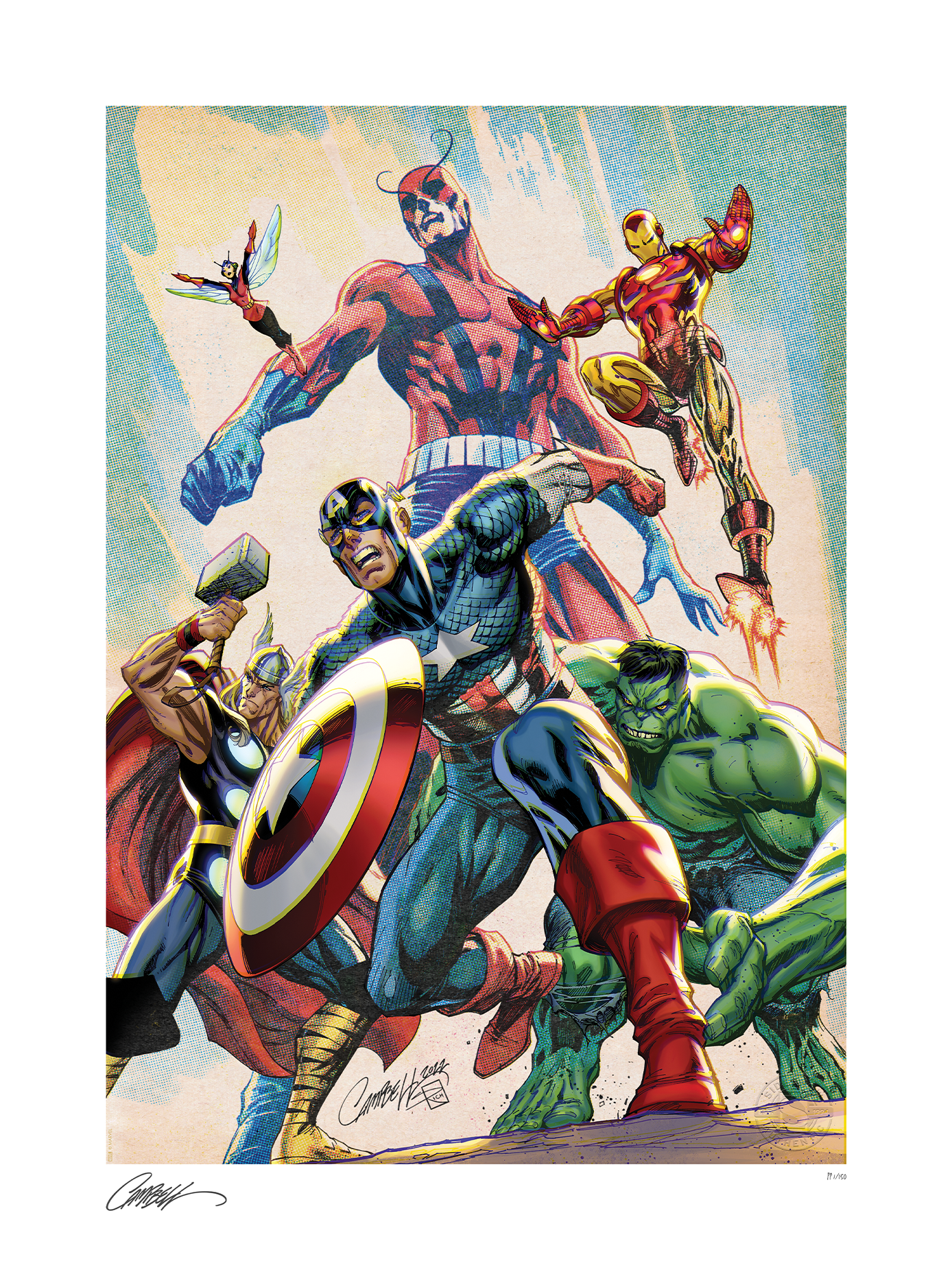 Legends leap off the comic book page and into your collection in this exciting illustration by fan-favorite artist J. Scott Campbell. On a day unlike any other, the Avengers first assembled to stop the threats they couldn’t face alone. This colorful composition features Thor, the Wasp, Giant-Man, Captain America, Iron Man, and the Hulk in one of the earliest outings for the super hero team-up. Shields, stingers, repulsors, hammers, and fists are raised and ready to tackle any nefarious villains who dare to challenge these mighty Marvel heroes.