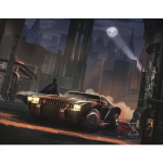 Vengeance takes to the Gotham City streets in The Batman Fine Art Print, featuring the infamous vigilante himself as he stands in a sprawling alley. Painted white words — messages from The Riddler — adorn dilapidated buildings, metal pipes, and the dusty pavement on which the Batmobile is parked. Shadows close in around The Batman, yet he stares resolutely at the one bright spot in the sky: the Bat-Signal, brilliant as it shines above black skyscrapers and against dark clouds.
