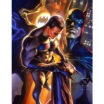 A legend. A hero. Batman is a watchful guardian and a silent source of hope. Far above Gotham, an unmasked Bruce Wayne contemplates his cape and cowl. The Bat-Signal shines brilliantly as he is surrounded by images of his crusading alter ego: bats, illuminated skyscrapers, and the costumed vigilante he has created to protect his city.