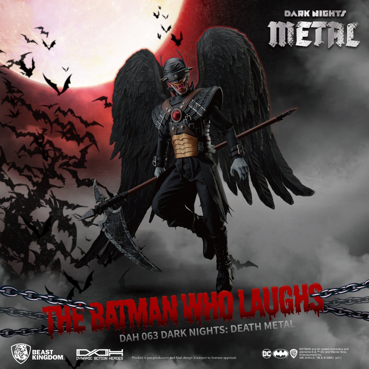 Beast Kingdom’s ‘Dynamic 8ction Heroes’ series of highly articulable action figures launches the ‘DAH-063 Death Metal Batman Who Laughs’, a figure representing a character of fear and madness! Standing at 20cm in height and with over 26 points of articulation, the figure brings to life the crazed, wide-mouthed face with 2 replaceable head sculpts. The Death Metal-inspired clothing is represented in all its glory using real cloth for the suit. The signature wings and long-handled sickle are also included for fans to enjoy. Recreate the magic from the comics by posing the DAH Batman Who Laughs from the many scenes that are now iconic. Orders yours from an official Beast Kingdom outlet today!