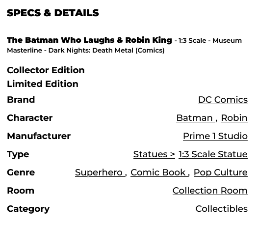 From Dark Nights: Death Metal, the epic event depicting the final battle for the fate of the DC Universe in the early 2020s, Batman Who Laughs & Robin King join the Museum Masterline.