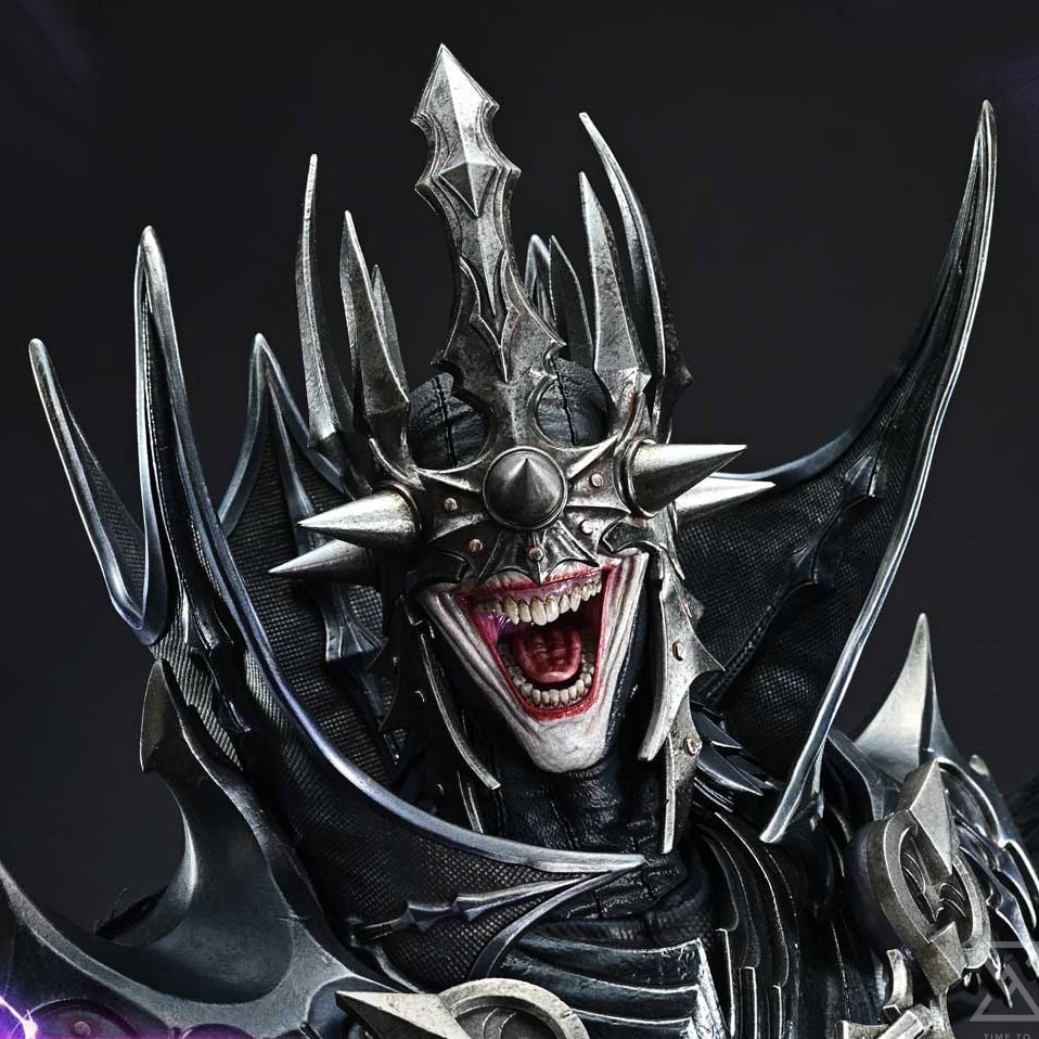 The Batman Who Laughs stands in a commanding pose, embodying immense power and ambition. A sharply reimagined visor. Steel tones with a subtle bluish hue. A sinister black cape flowing ominously. Every element of color and sculpt comes together to create a dark and majestic presence.