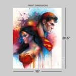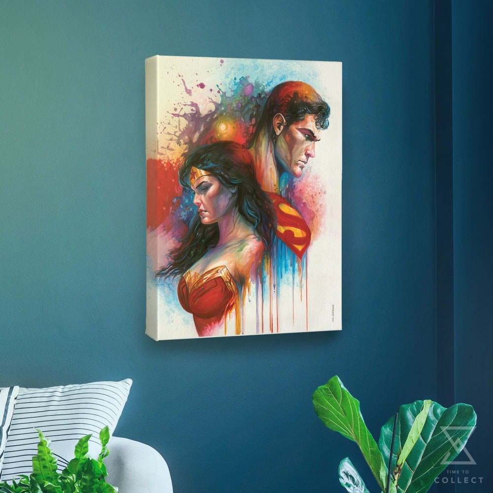 Featuring Wonder Woman and Superman, this DC Comics art print is crafted with premium canvas reproduction techniques and hand-wrapped around a deep, hardwood stretcher bar. Hung as an ensemble or by itself, this frame-less presentation gives you a versatile way to display this amazing super hero artwork in your home.