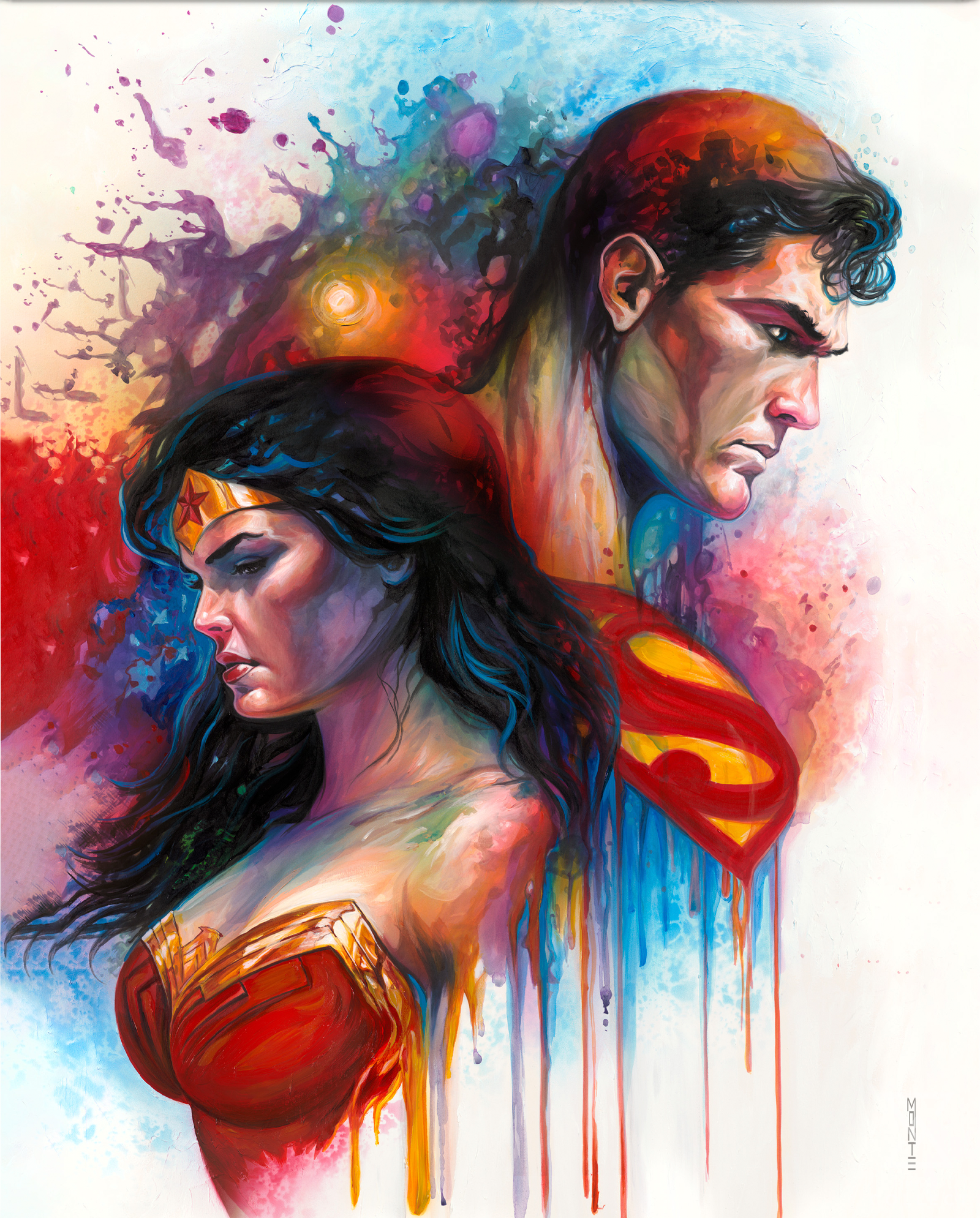 “I’m showcasing two of my lifelong favorite characters, and instead of them gazing directly at the viewer or up towards the sun in a heroic manner, they are ‘back-to-back’ in a protective manner. Also, their eyes are slightly downward and introspective, they have the ‘weight of the world’ on their shoulders…and on their minds. I believe these characters represent the very best that we can be as humans, they are also not regular humans themselves, but that doesn’t mean that their decisions don’t also carry as much weight as their strength. They too would be burdened by their decisions, their actions….or their lack of action. For that reason, I find this piece carries an ‘emotional weight’ and makes both of these Super Heroes, a little more human, a little more like us, yet they still remain a symbol of strength and of character.” – Monte Moore