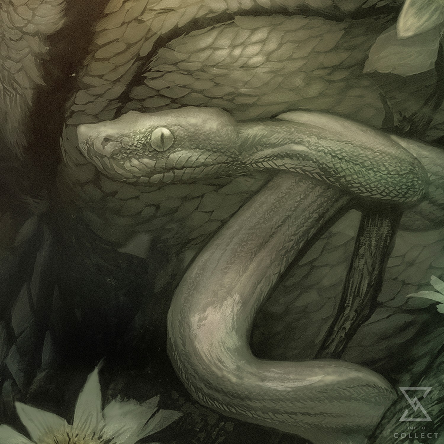 Expertly reproduced from the original oil painting, this portrait lends a profound air of mystery and melancholy to the Creature. Immersed in flora, fauna, and fog, this dweller of the deep emerges in a muted color palette and rivulets of murky water. A dragonfly and skull — a memento mori — complete this surreal scene of decay and discovery.
