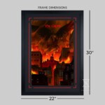 Buildings burn, people die, and a vengeful spirit rises to exact revenge in this intense illustration. With his guitar strapped to his back, the undead rockstar Eric Draven overlooks a city on fire. Far above Eric’s shadowy silhouette, a crow spreads its wings while its black feathers sweep over plumes of ash and smoke. Detroit’s Devil’s Night has begun, and no evildoer is safe from The Crow’s crusade.
