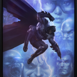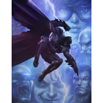 Drawing inspiration from the iconic cover of Batman: The Dark Knight Returns, artist Dave Wilkins captures Bruce Wayne’s descent on a lawless Gotham. In the absence of its Caped Crusader, the city has fallen to ruin beneath villains and gangs running unchecked. This moody composition features familiar faces of both friends and foes as Batman returns to the unending fight, illuminated by a single bolt of lightning. Two-Face, Robin (Carrie Kelley), Commissioner Gordon, Green Arrow, the Mutant Leader, The Joker, and Superman can be seen as symbols of the reasons both good and bad that inspire the Dark Knight to stand against crime once again.