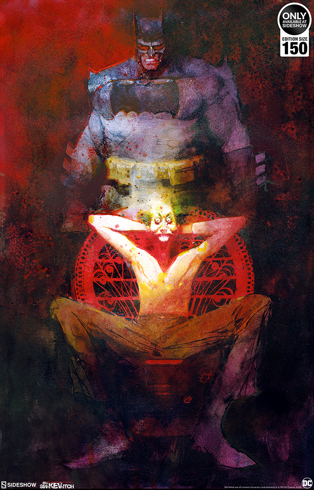 The Dark Knight Returns: The Last Crusade Fine Art Lithograph pits Batman against his greatest foe The Joker in a grim and engaging portrait of legendary justice versus infamous villainy. Sienkiewicz captures the Clown Prince of Crime and the grizzled Caped Crusader in his unique and widely-acclaimed style that blends artistic abstraction with the darkness and insanity of these two archenemies. Originally created as a DC Comics variant cover, this stunning illustration has been specially reproduced as a fine art lithograph collectible exclusively available through Sideshow.