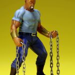 Criminals better watch out, because Luke Cage is on the case! The hero for hire stands ready to dish out justice as only he can, standing in a slight crouch with his legs spread for balance. Luke leans forward slightly and menacingly, with his arms hanging down and ready for action. The Defender is massively muscled and his superhuman physique shows through his casual white t-shirt and blue jeans which he wears with black boots and a belt with a gold “C” logo buckle. Luke also wears big golden bracelets and carries two lengths of chains that evoke the image of his costume from his days as Power Man! His clenched teeth and scowl are enough to intimidate any criminal, and he looks like he just stepped right out of a comic book. Sculpted by Junnosuke Abe (RESTORE), the master behind all of the Marvel ARTFX+ releases, Luke Cage stands 7 ½ inches tall (1/10th scale) with magnets in his feet providing perfect stability on the included display base. Add this warrior for justice to your display and pair him with other Defenders ARTFX+ Statues Daredevil, Jessica Jones, and Iron Fist!