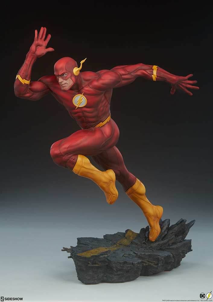 The Flash Premium Format™ Figure measures 17” tall and 20” deep as the Scarlet Speedster races down a roadway, kicking up rubble beneath his yellow boots. This hyper-dynamic statue catches Barry Allen in a moment of bullet time, freezing him before our eyes before he speeds off to save the day.