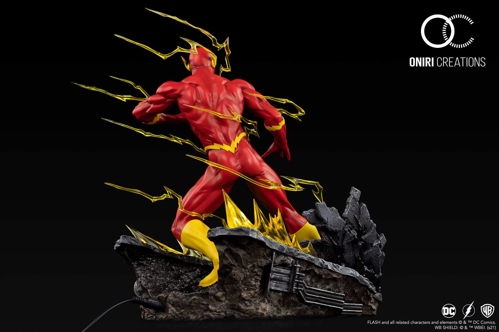 His speed is such that it slices through the asphalt on which he is braking. The Speed Force emanating from his body is represented by yellow lightning bolts done in clear resin.