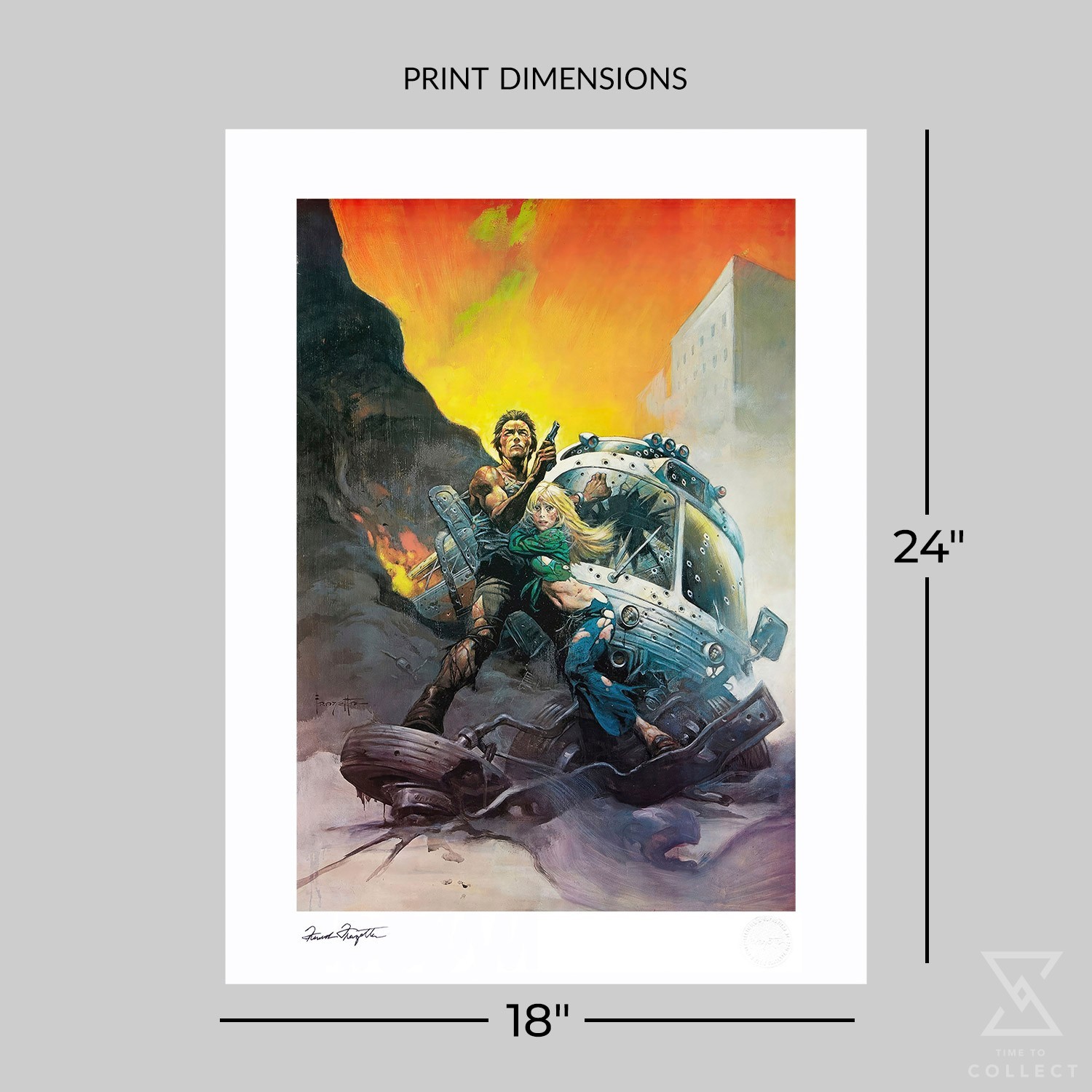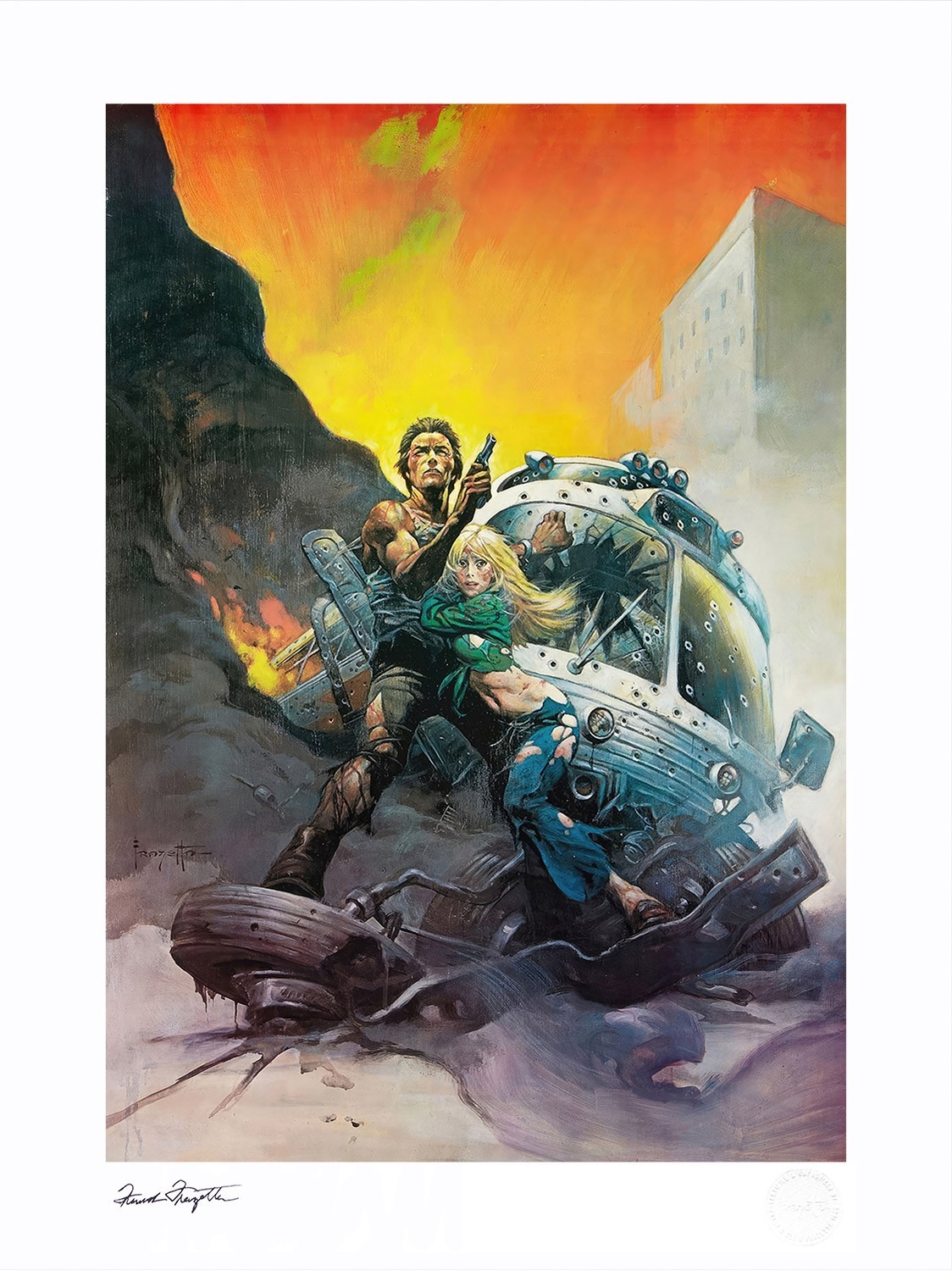 From futuristic fantasies to brutal battlefields, Frank Frazetta’s awe-inspiring compositions encompass the furthest reaches of human imagination … just like cinema! In this incredible illustration, Ben Shockley and Gus Mally forge ahead on their harrowing journey from Phoenix to Las Vegas. Emerging from a fiery crash, the pair stands atop bits of twisted metal, broken glass, and melted rubber. Although their bodies and clothes are battered from the impact of the fallen armored bus, Ben Shockley wields his service weapon in defense of his criminal companion. He won’t go down without a fight — so will you let him through, or accept your demise?