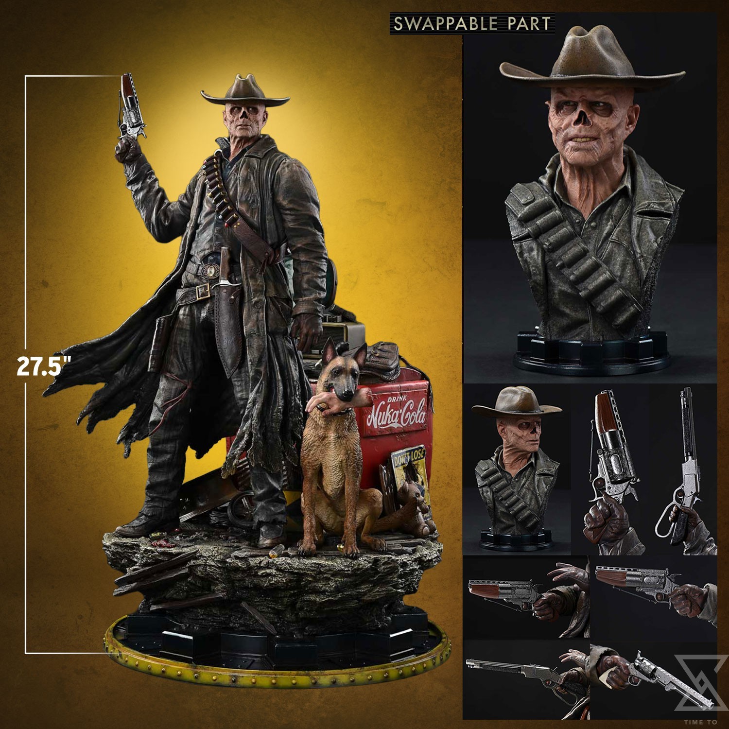 His presence, feared by all across the Wasteland, is captured with exquisite precision in 1:4 scale. The pose, aiming The Ghoul’s Revolver from the hip, evokes the unforgettable shootout in Filly. From the arch of the torso to the fanning left hand, every detail has been refined to create a taut, suspense-filled balance.