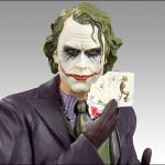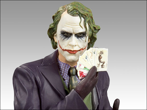 The Joker displays a handful of his signature playing cards in this hand-painted cold-cast porcelain bust. Packaged in a 4-color box, The Joker bust measures approximately 4.75” tall x 3” wide x 2.5” deep.