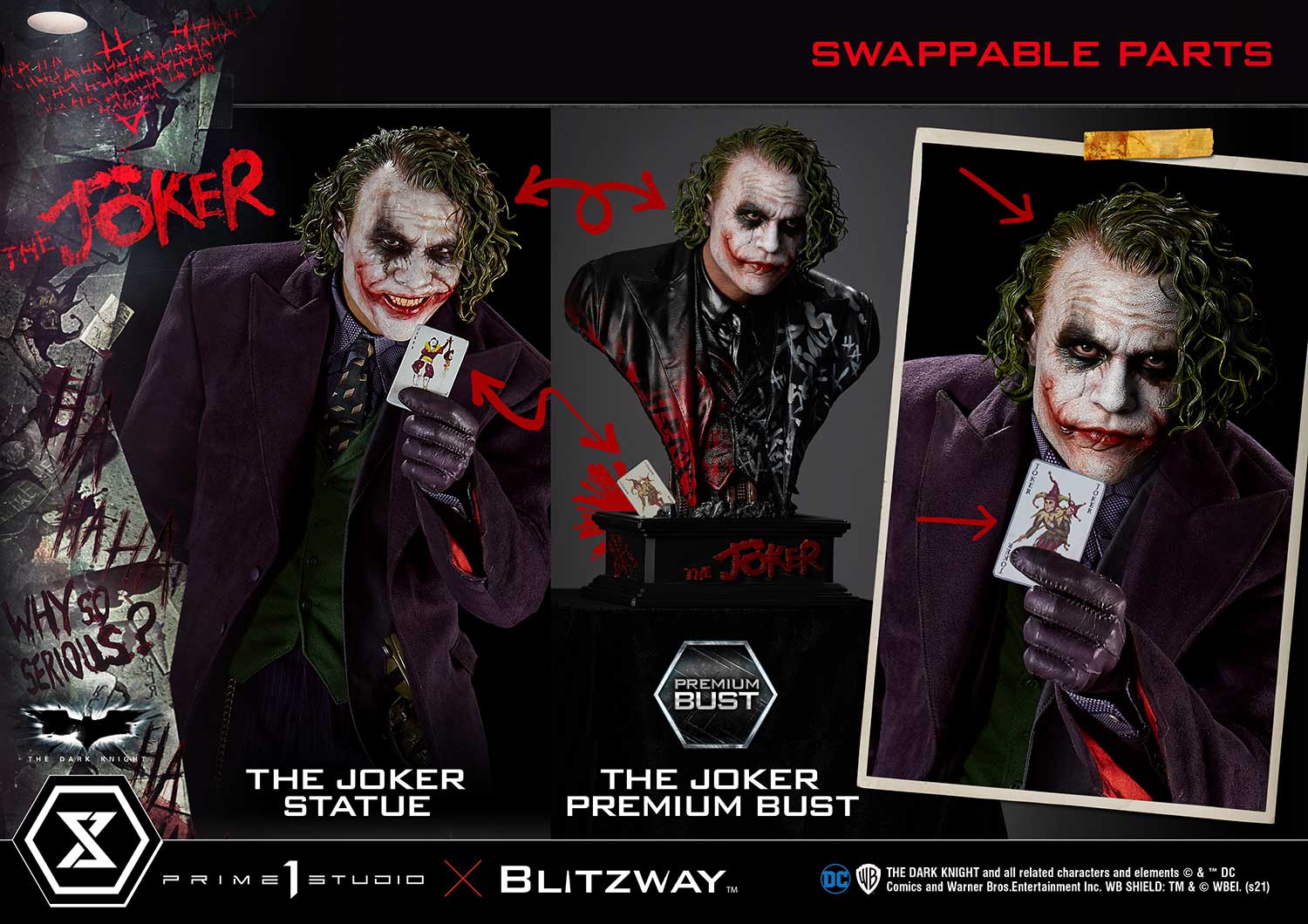 - Blitzway has crafted an extremely accurate detailed likeness, life-like hair, and Dark Knight-themed base. In addition, this bust comes with the Playing Card from Batman Begins and the Joker portrait, which are compatible with our MMTDK-01/01S The Joker 1:3 Scale Statue!
