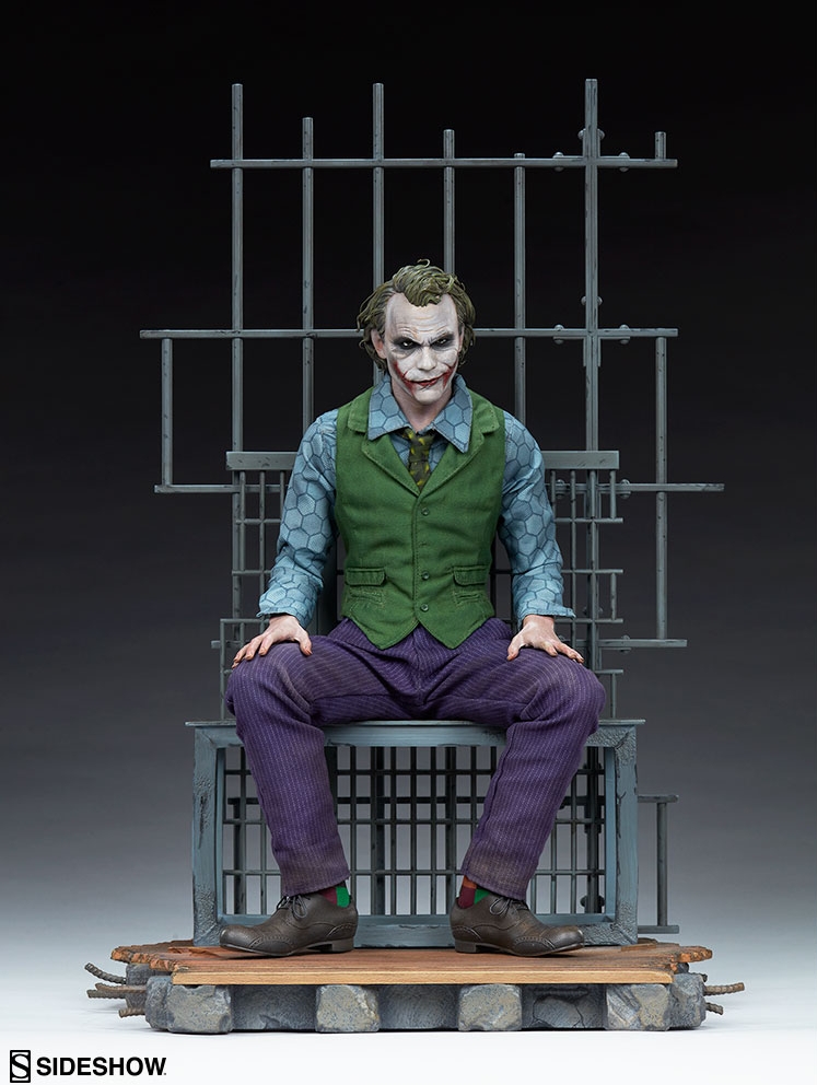 The Joker Premium Format™ Figure measures 20” tall and captures every chilling detail of Heath Ledger’s haunting performance as the Clown Prince of Crime himself. Based on the Gotham City police department scene from the film, this collectible includes a detailed environment base with jail bars that can be magnetically placed in front of or behind the figure for multiple display options.