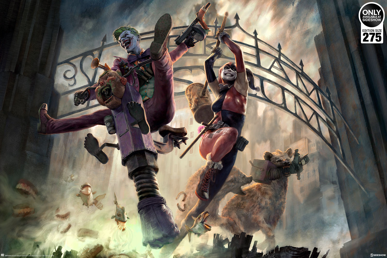 SIDESHOW IS PROUD TO PRESENT THE JOKER & HARLEY QUINN: ARKHAM ASYLUM BREAKOUT FINE ART PRINT BY ARTIST JON FOSTER.