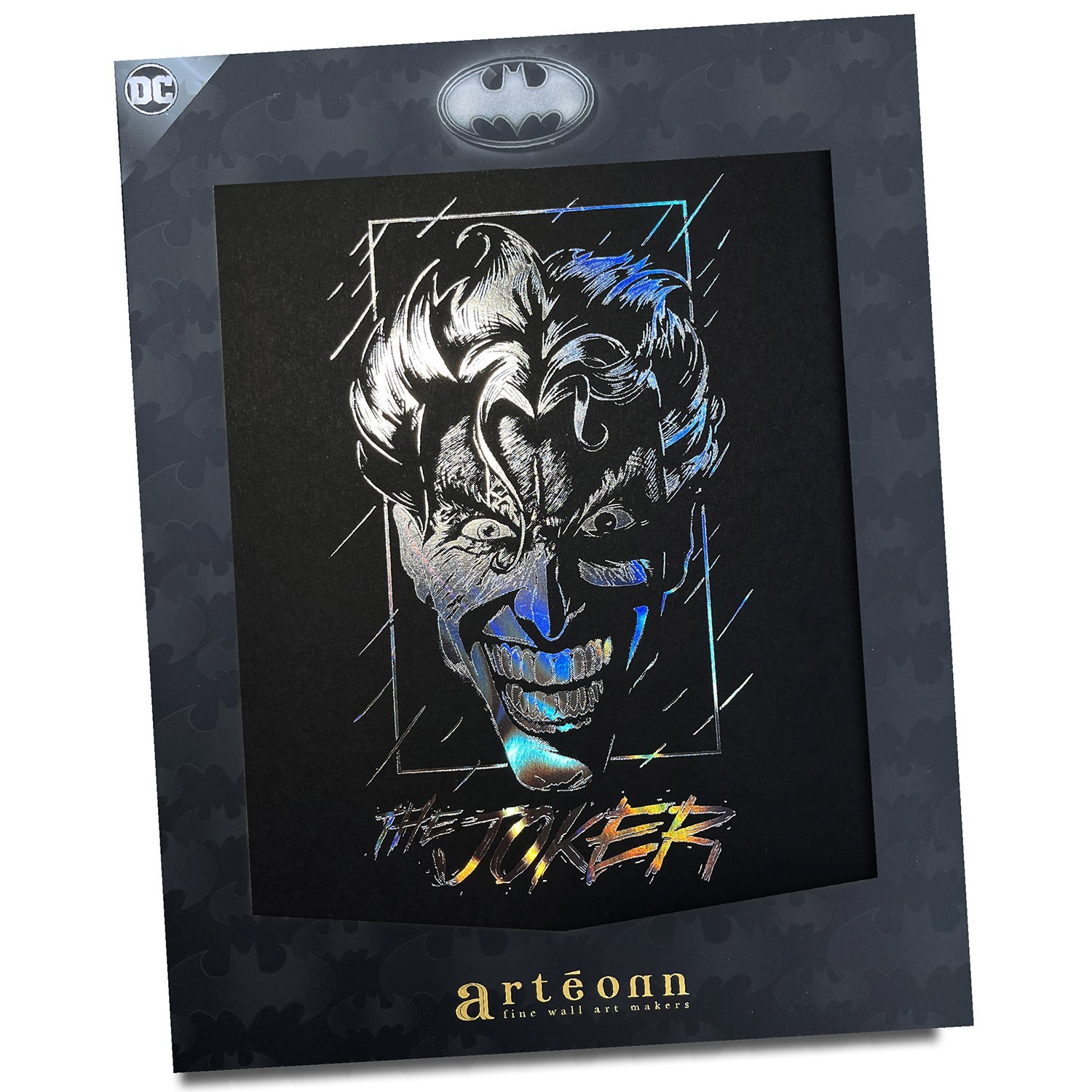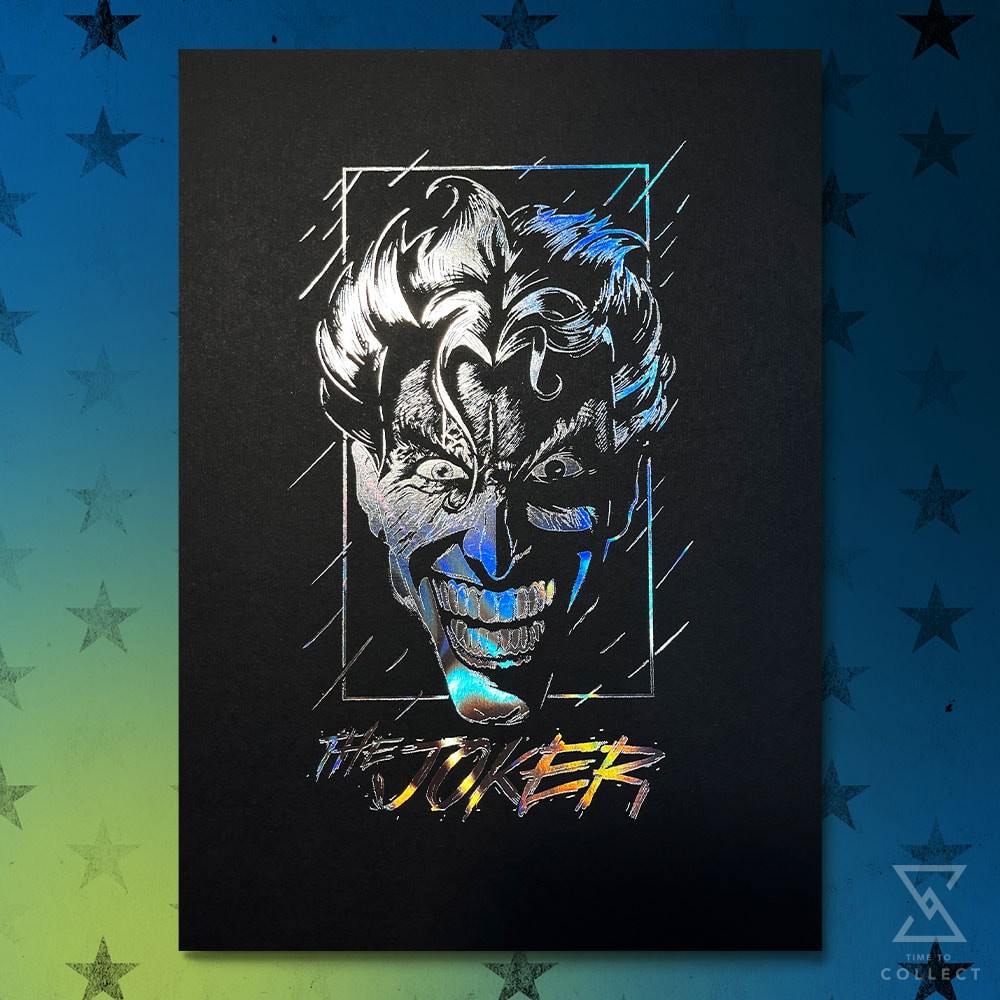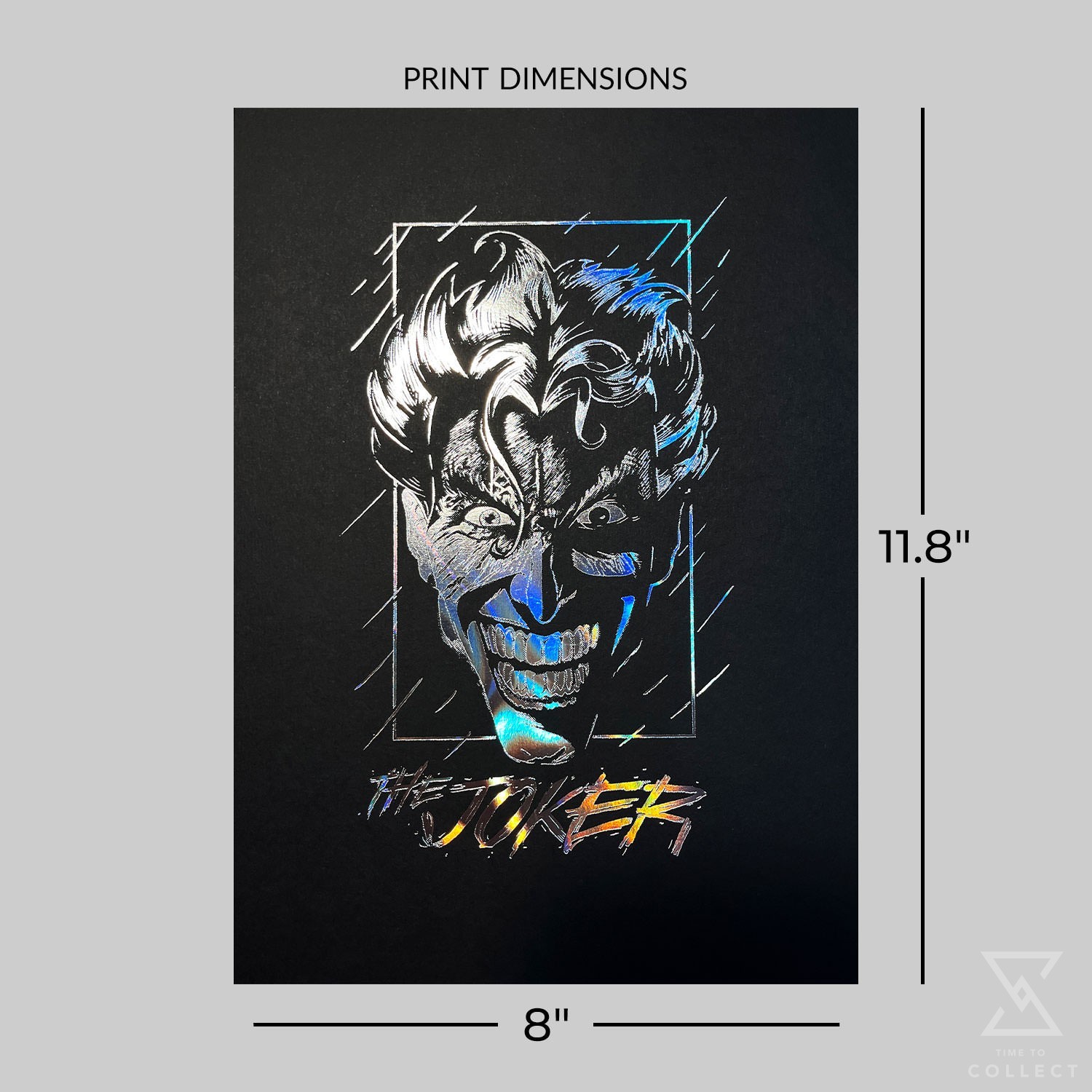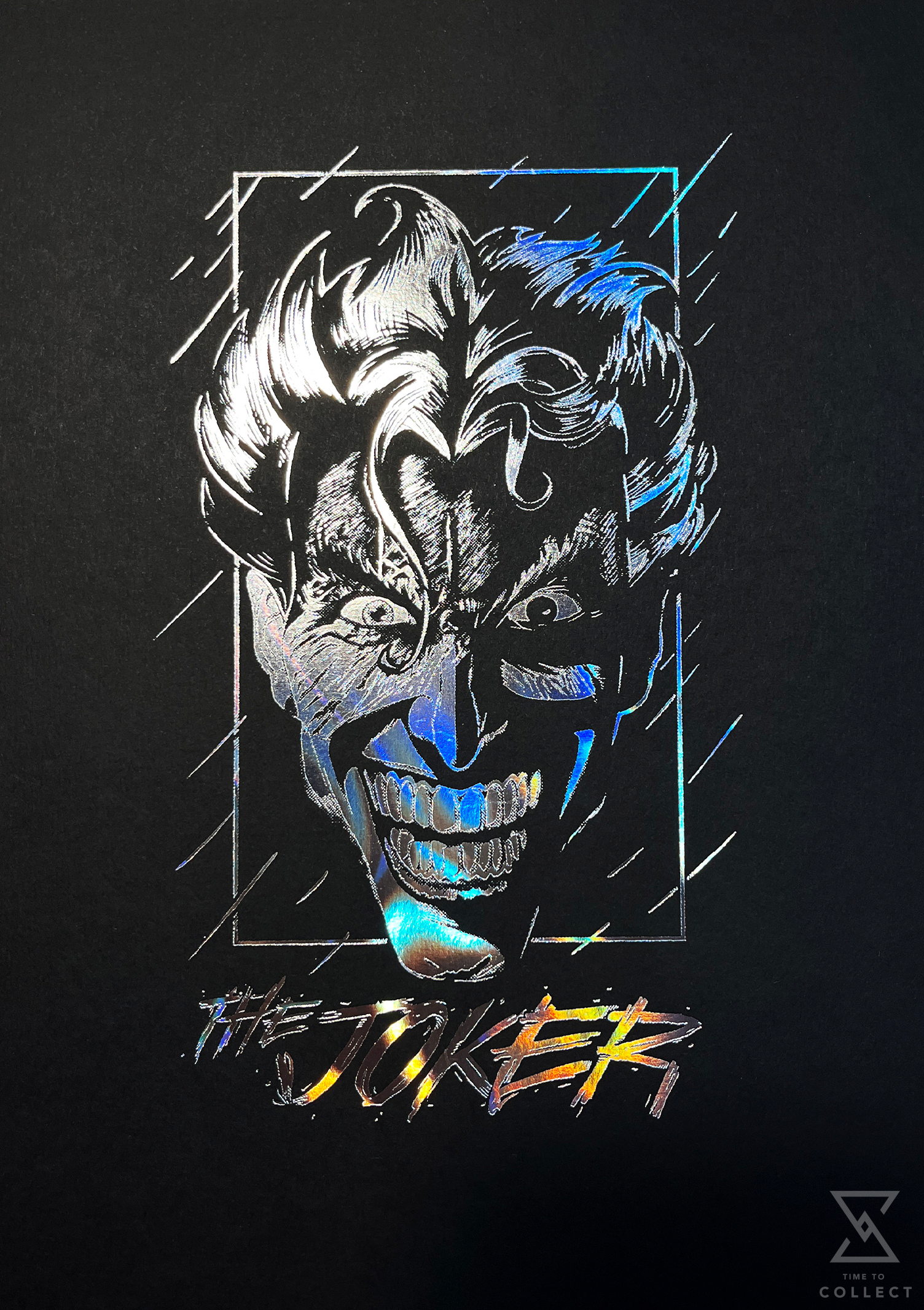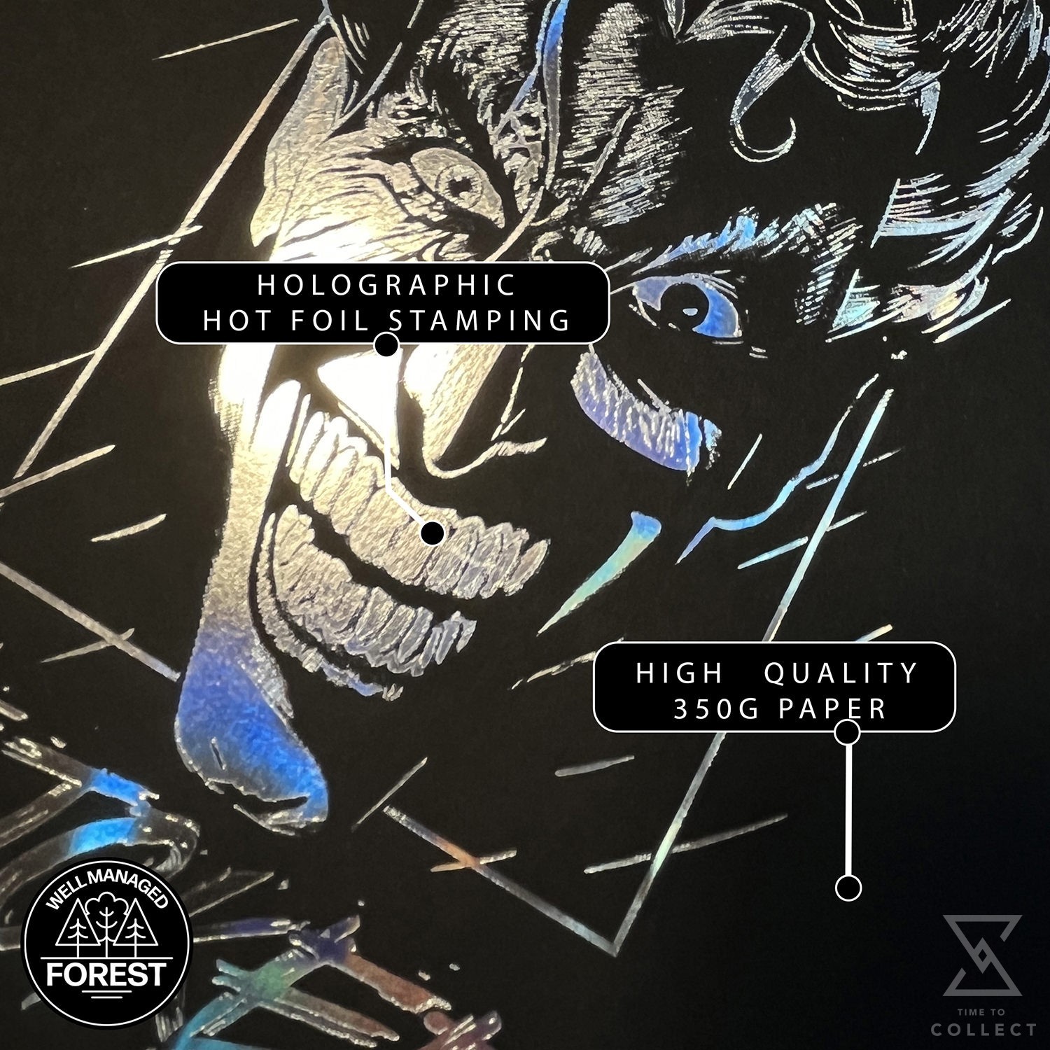 Meticulously produced using the artisanal technique of letterpress, The Joker (Holographic) Foil Letterpress Poster features an embossed Holographic foil image on ebony black paper.