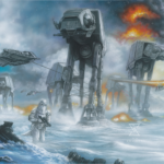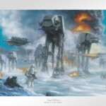 The Last Holdout captures the dramatic and desperate final moments of the Battle of Hoth as Imperial forces overwhelm the Rebel defenses as seen in Star Wars: The Empire Strikes Back™. Imperial AT-AT walkers dominate the snowy landscape, their imposing mechanical forms towering over the battlefield amid explosions and combat debris. In the foreground, Imperial snowtroopers advance across the icy terrain. Rebel snowspeeders engage the walkers, with one using tow cables to bring down an AT-AT while another fires directly at a walker. The color palette features the cold blues and whites of Hoth’s frozen landscape, dramatically contrasted with the warm oranges and reds of explosions and blaster fire.
