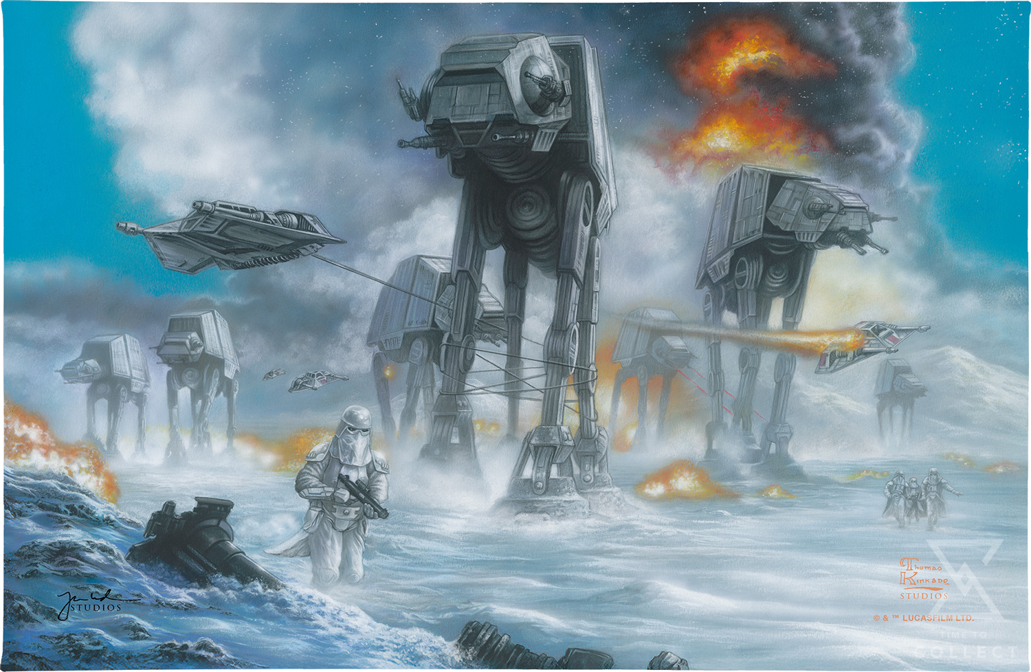 The Last Holdout captures the dramatic and desperate final moments of the Battle of Hoth as Imperial forces overwhelm the Rebel defenses as seen in Star Wars: The Empire Strikes Back™. Imperial AT-AT walkers dominate the snowy landscape, their imposing mechanical forms towering over the battlefield amid explosions and combat debris. In the foreground, Imperial snowtroopers advance across the icy terrain. Rebel snowspeeders engage the walkers, with one using tow cables to bring down an AT-AT while another fires directly at a walker. The color palette features the cold blues and whites of Hoth’s frozen landscape, dramatically contrasted with the warm oranges and reds of explosions and blaster fire.