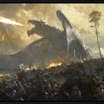 Greg Rutkowski has cemented himself in the modern fantasy canon through both popular licensed art and completely original works. The Last One depicts a battle of mythic proportions as hundreds of armored knights charge through the valley where a dragon looms. They raise their spears and war banners high while the mighty lizard’s flames burn hot enough to scorch the mountains above. Rising ash gives the scene a hazy coloration, obscuring the dragon and turning the battlefield into a roiling sea of silver-clad soldiers.