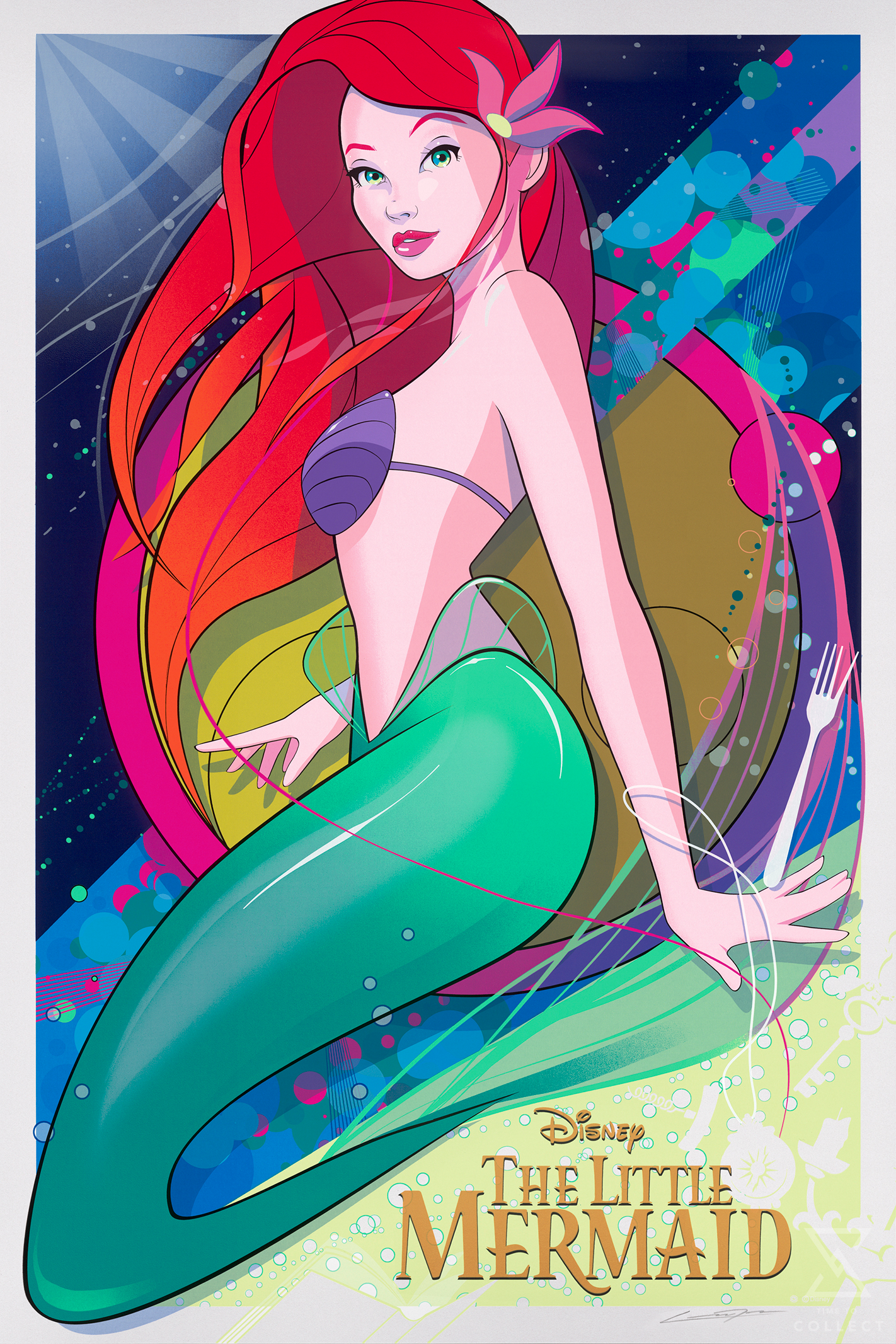 Renowned artist Craig Drake delivers an astonishing design in his series of Disney Princesses, this time portraying the head-strong, wonderfully defiant heroine from Disney’s 1989 animated classic The Little Mermaid. Reimagined in all of her elegance and beauty in Drake’s signature style, Ariel is depicted swimming in a sea of intricate and vibrantly colored light, fluid lines, bubbles, and underwater patterns. She is portrayed alongside a few cherished items from her collection of human treasures, a reminder of her curious and adventuresome spirit, and her ever-burning desire to explore the world up above.