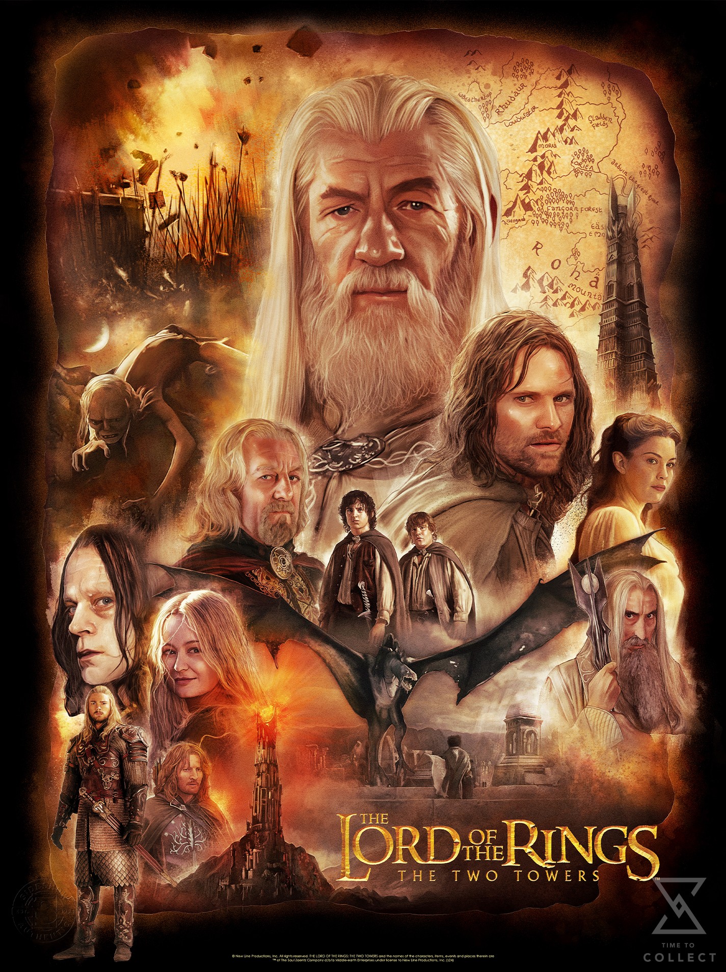 Relive a perilous quest across Middle-earth with a dark, detailed tableau of characters and moments from The Two Towers. The newly returned Gandalf the White watches from the center. His serene portrait is surrounded on all sides by allies and enemies Aragorn, Arwen, Théoden, Frodo, Sam, Éowyn, Éomer, Faramir, Gollum, Wormtongue, and Saruman. Scenes of a battlefield, Isengard, a map of the land, and the Hobbits’ encounter with a Fell Beast complete this dramatic illustration.