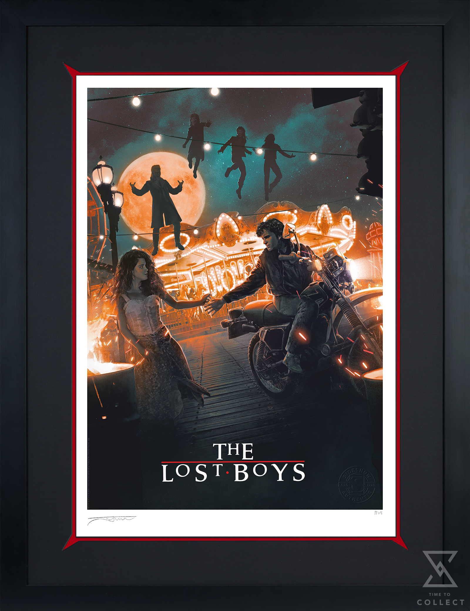 Each The Lost Boys Fine Art Print features an authorized, automated artist signature and an embossed Seal of Authenticity as a part of the limited edition of 200 pieces. The print is available as an unframed giclée, or collectors can take advantage of custom framing offered for a limited time only! This horror movie poster artwork makes a timeless must-have for any film fan’s wall (but maybe don’t leave it hanging upside-down during the daytime).
