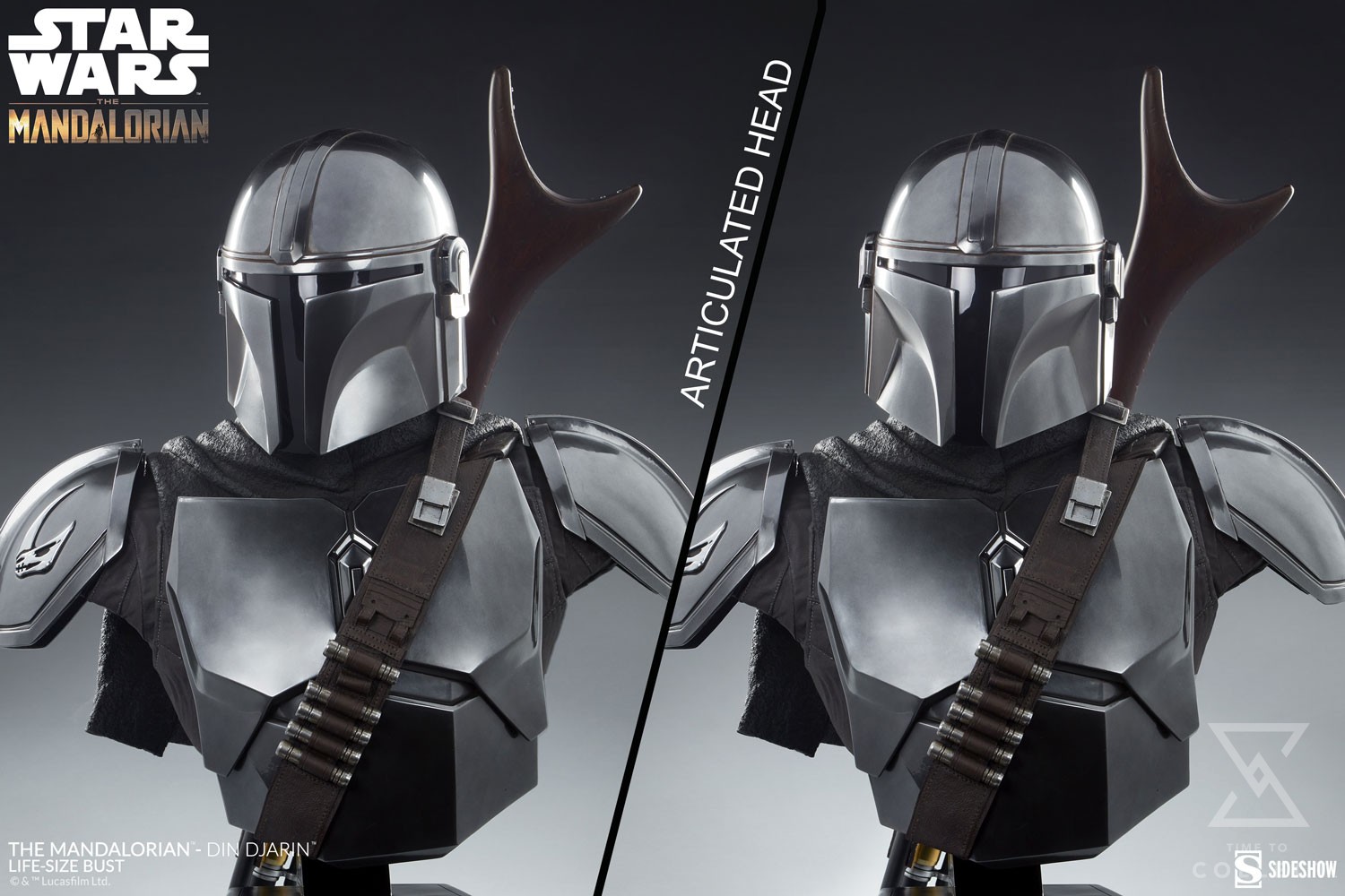 The Mandalorian – Din Djarin Life-Size Bust measures 33.5” tall and 27” wide as he remains vigilant searching for his next target. With rotational articulation in the helmet, collectors can directionally change his focus for added storytelling in any display. His sleek silver armor and costume elements are fully sculpted, recreating his now-iconic silhouette in fiberglass design. Din Djarin’s chest armor, helmet, bandolier, and even cape bear details of weathering and distress accumulated in his dangerous travels. Finally, his right shoulder pauldron features the unique mudhorn™ signet bestowed upon him by the Armorer™. For those who walk the Way of the Mandalore™, this is a must-have centerpiece in any galactic display.