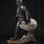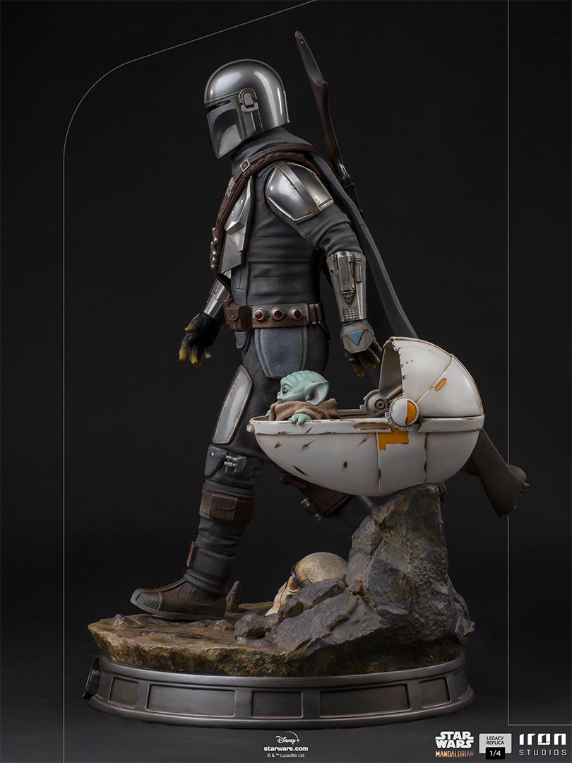 Walking on a base in the arid terrain of Nevarro, Mando, a lone Mandalorian bounty hunter, walks protected by his beskar armor, a rare and valuable metal that resists even to lightsaber attacks, forged by a mandalorian blacksmith, qualified in a ritual way, and carrying his deadly Rifle Amban on his back, a powerful weapon capable of vaporizing his targets. Ignoring the helmet of a Stormtrooper lying at his feet, indicating the fall of the once powerful Empire, he follows next to a floating cradle where his protégé is, the mysterious child known as Grogu, who apparently looks like the legendary Jedi master Yoda with the appearance of a baby, and has a strong connection with the Force as well. These captivating characters from the hit series The Mandalorian are among the newest works by Iron Studios unveiled at the Inside Iron Studios virtual event at CCXP Worlds 2020, with the fantastic “The Mandalorian and The Child Legacy Replica 1/4 – The Mandalorian – Iron Studios”.