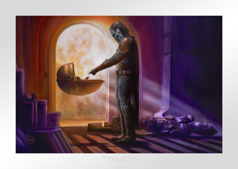 The Mandalorian: Turning Point unframed limited edition paper print presented by Thomas Kinkade Studios by artist Monte Moore features premium heavyweight 100 lbs paper, long-life pigment inks that outperform conventional press inks, and an individually numbered certificate of authenticity matched to the art piece.