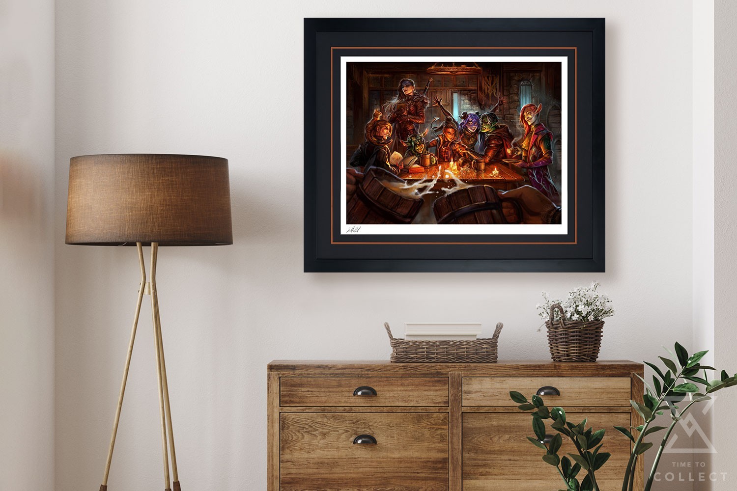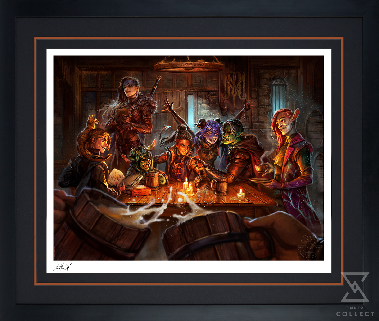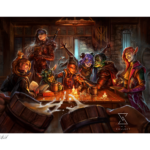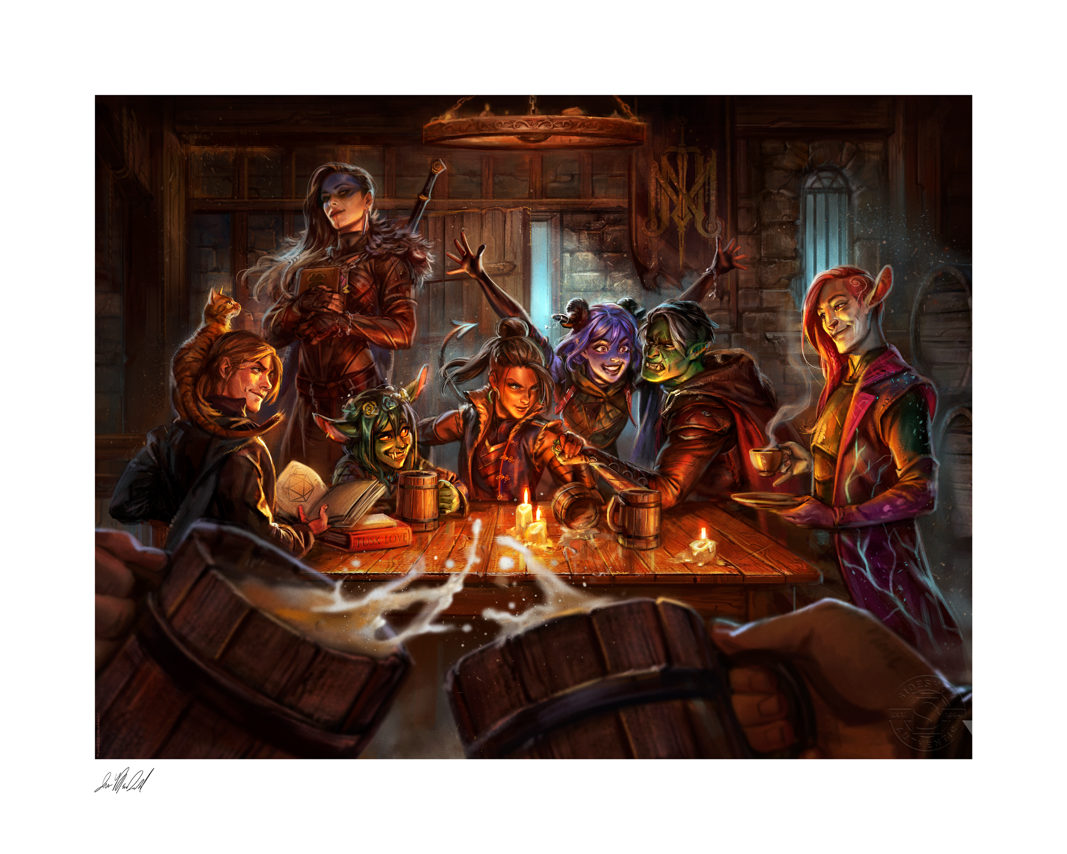 Raise your tankard or your teacup as a toast to the intrepid adventurers of the Mighty Nein in their journey across the continent of Wildemount. This fine art illustration features heroes Caleb (with Frumpkin), Yasha, Nott, Beau, Jester, Fjord, and Caduceus as they find respite at a local tavern, studying spells and engaging in friendly feats of strength. Make a perception check to spot the character details hidden throughout the image, including the hint of a familiar storyteller in the foreground, cheering on the Mighty Nein after another incredible quest.
