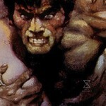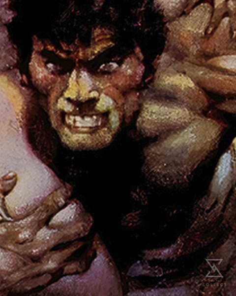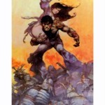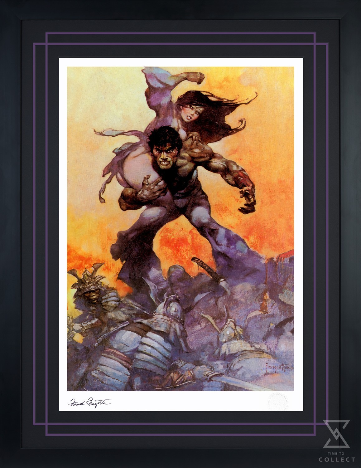 Throughout his impressive career, Frank Frazetta painted countless iconic characters, giving visual life to stories and scenes that lived only in words on pages. In this intense illustration, Frazetta captures the drunken gangster Billy Byrne’s first truly heroic deed. Billy fends off armored headhunters with the beautiful Barbara slung over his shoulders, the only soft thing among so much brutality. Her rescuer’s savage expression and furious posture are matched only by the burning orange sky behind him. But as the world around them catches fire, love may also ignite between these two disparate souls…