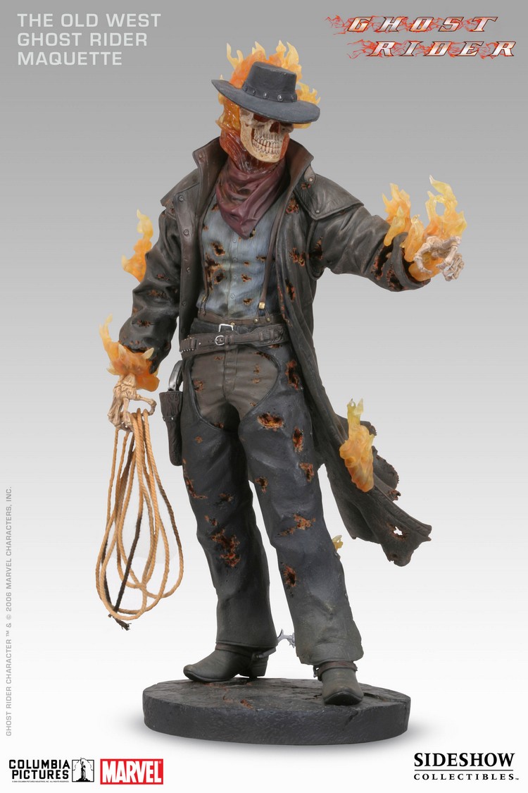 Sideshow Collectibles and Marvel are proud to present the West Rider Maquette, based on designs from the upcoming major motion picture, Ghost Rider. Under the supervision of Creative Director Tom Gilliland, the Sideshow creative team studied the conceptual artwork created from the film, and together with sculptor Ray Villafane, translated the conceptual designs into a fully realized sculptural artwork. The prototype was finished with Tom’s paintwork, detailing and enhancing the sculpted cowboy clothing, bone, and fire.