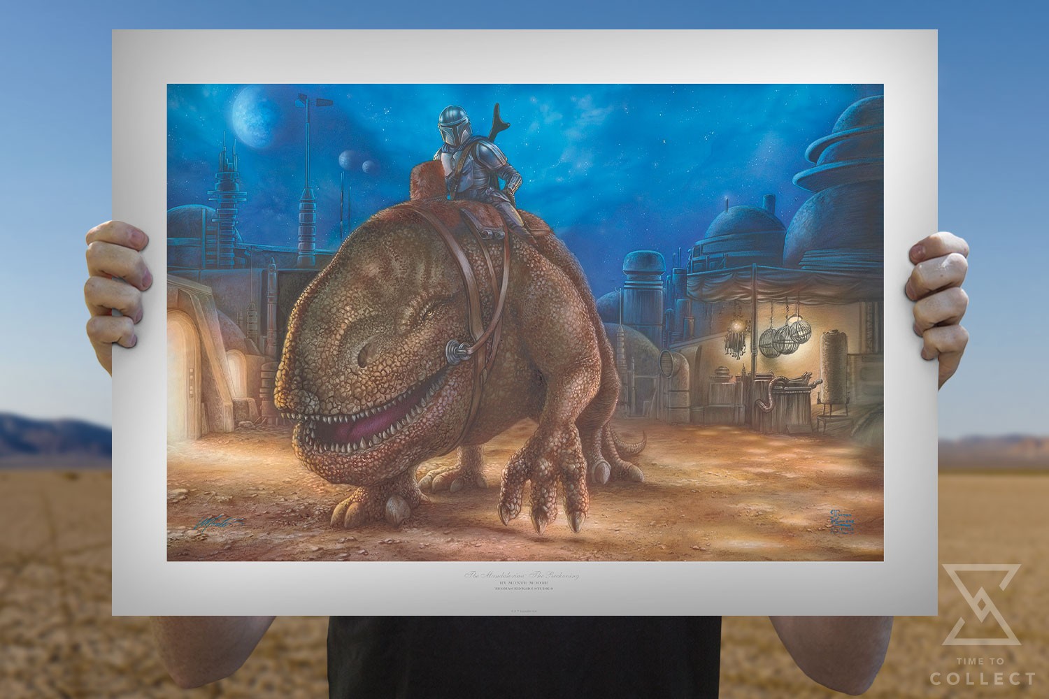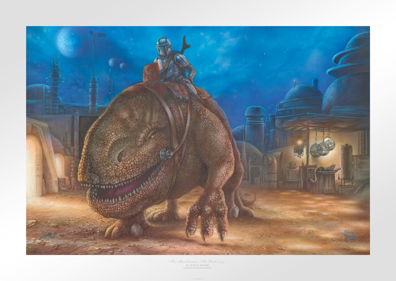 The Reckoning by Monte Moore shows Din Djarin after encountering Toro Calican(TM), a young bounty hunter looking to join the Bounty Hunter’s Guild by capturing Fennec Shand(TM). Mando and Calican come across a Dewback with a dead bounty hunter attached to it, which turns out to be a trap by Shand. Calican, in a hastily planned bid for fame and glory, tries and fails to best the Mandalorian in a showdown.