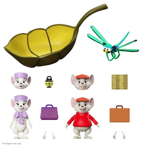 Two mice are better than one! As seen in the classic Disney film The Rescuers, these two little mice from the Rescue Aid Society have a tall order ahead of them to rescue Penny! This ULTIMATES! multi-pack features both Miss Bianca and Bernard with interchangeable heads and hands plus multiple accessories including luggage, a lantern, and a map. Miss Bianca and Bernard are also accompanied by Evinrude and his leaf-boat, ready to go for a ride through Devil’s Bayou! Rescue your collection with this set of figures! In this set you’ll get Bernard and Miss Bianca figures, each with alternate hands, head, and luggage. You’ll also get a lantern, map, leaf boat, and insect Evinrude figure!