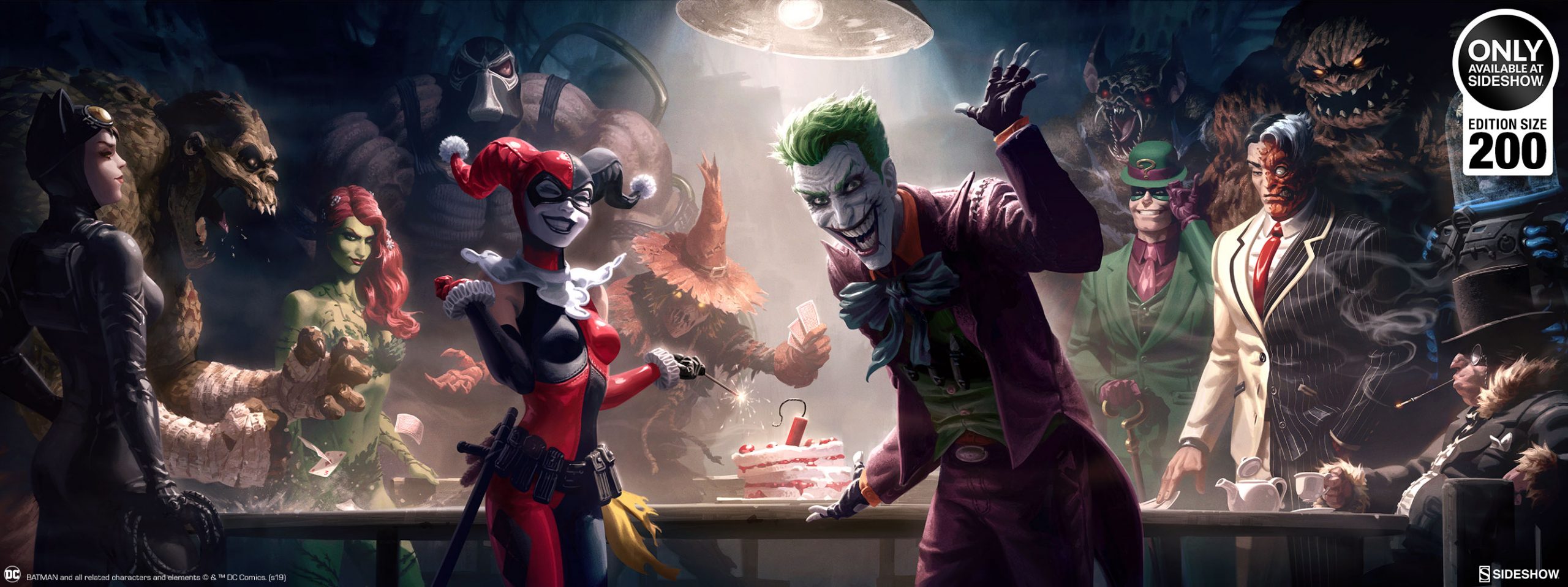 From left to right, this DC Comics fine art collectible includes Catwoman, Killer Croc, Poison Ivy, Bane, Harley Quinn, Scarecrow, The Joker, Man-Bat, The Riddler, Clayface, Two-Face, Mr. Freeze, and The Penguin- 13 iconic villains in all. Every The Rogues Gallery Fine Art Print features an authorized, automated pencil signature and an embossed seal of authenticity as a part of the limited edition of 200 pieces.