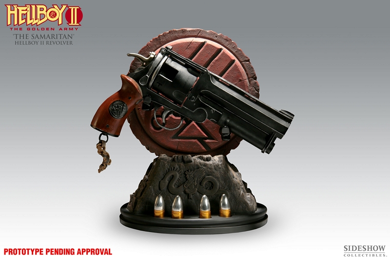 Sideshow is proud to bring you this 1:1 scale prop replica of ‘The Samaritan,’ Hellboy’s famous pistol used in the film Hellboy II: The Golden Army. The gun features an opening chamber, which allows you to remove all four metal bullets from the rotating cylinder! The display stand features the an engraved B.P.R.D logo and four bullet display spaces. The round, red portion of the stand can be easily removed from the base to wall-mounted for alternate display. Each limited edition gun is hand crafted in dense metal with a real wooden grip and authentic leather braid. The Samaritan replica pistol is hand crafted to Sideshow’s exacting standards, ready to take its place in your Hellboy display!