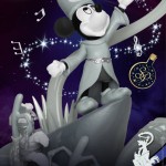 Perfectly honoring the nostalgic movies of the 1940s, the black and white, limited D-Stage gives collectors a unique snapshot from the movie itself. The stary sparkles of Mickey atop a wave of magic are combined with little intricate touches such as the naughty brooms climbing the winding stairs as well as the splashing waves of the magic kingdom all placed on top of the sorcerer’s book!