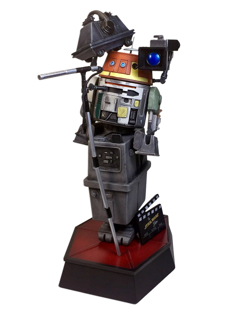 The statue is hand painted and limited to 500 pieces, and features the iconic TIE Fighter Coffee Table as a base, as well as The Star Wars Show’s droid mascots stacked on top of one another capturing the action. There’s Gonk, the slow moving battery supporting the weight of the “Director of Chopperations” C1-1OP, who is holding boom operator/mouse droid extraordinaire CH-33Z!