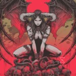 This infernal temptress has her sights set on you! Crouched atop a blood-soaked pile of her victims’ skulls, it’s plain to see that the succubus hasn’t sated her hunger yet. A sanguine moon frames her horned portrait like a halo, as bat wings curl around her quarry. She has an ashen complexion flecked with blood and jewels, marked by frenzy and ecstasy as she feasts on hapless mortals. Beneath the beastly woman, a large snake winds itself through the carnage in search of its share of the sinner’s spoils.
