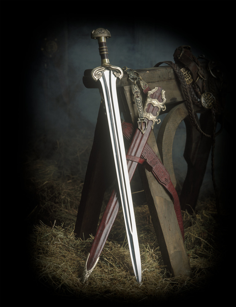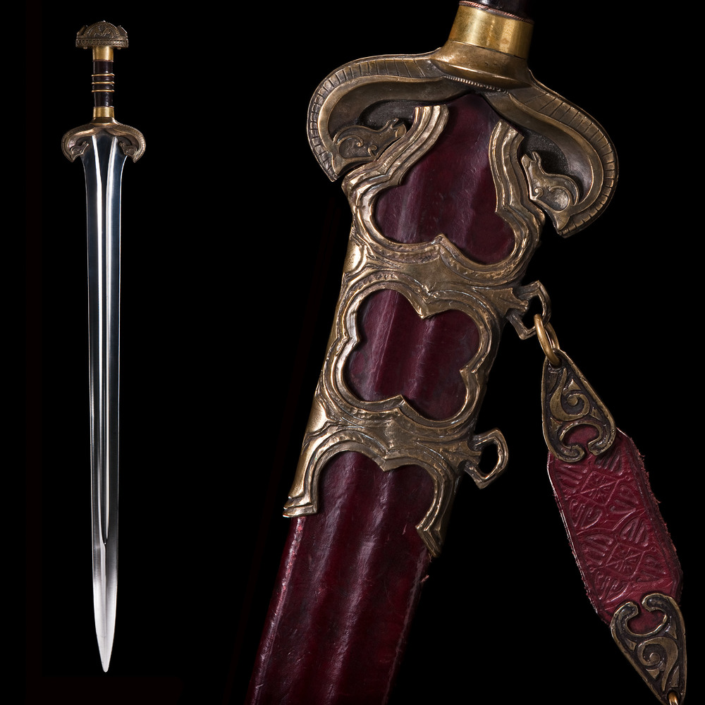 Éowyn’s sword is short, with a broad blade and single wide fuller, befitting someone of smaller stature. Yet it also suggests the Lady of Rohan was surprisingly strong for her size. The blade is made from tempered spring steel, ground into a point that was destined to fell the darkness before her. The crossguard and pommel are made from solid bronze with a reddish hue that mellows towards gold as it ages. The wooden grip is covered with leather and decorated intricately with three bronze rings. This sword is the absolute epitome of craftsmanship.