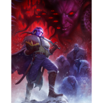 Before Kingsley, before Mollymauk, there was devilkin Lucien and the Tombtakers. From Shadycreek Run to the biting tundras of Eiselcross, these blood hunters march towards their definitive goal — to overtake the Cognouza Ward of Aeor and restore the Somnovem who betrayed their city. This chilling portrait shows Lucien, the Nonagon, in possession of the ritual tome that guides him and his psychically linked allies — Cree, Zoran, Otis, and Tyffial — onward. Lurking above is the Neo-Somnovem, what ambitious Lucien is destined to become.