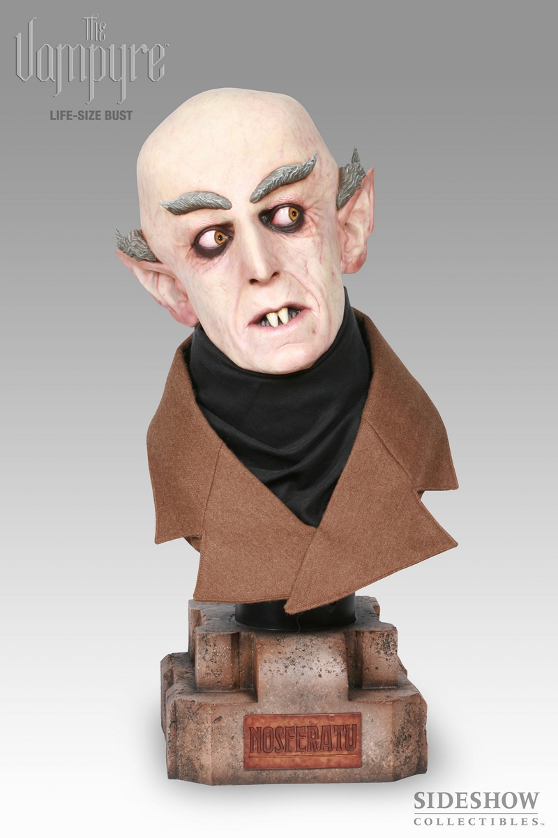 Sideshow Collectibles is proud to bring you the life-size bust of Max Schreck as Nosferatu. Every eerie wrinkle and furrow has been captured exactly in this frighteningly life-like portrait. The distinctive costuming has been reproduced in actual fabric, adding more life-like realism. Each bust is hand cast in fiberglass, and hand finished to exacting standards. The bust is mounted on a decorative base, and each piece is individually hand-numbered.