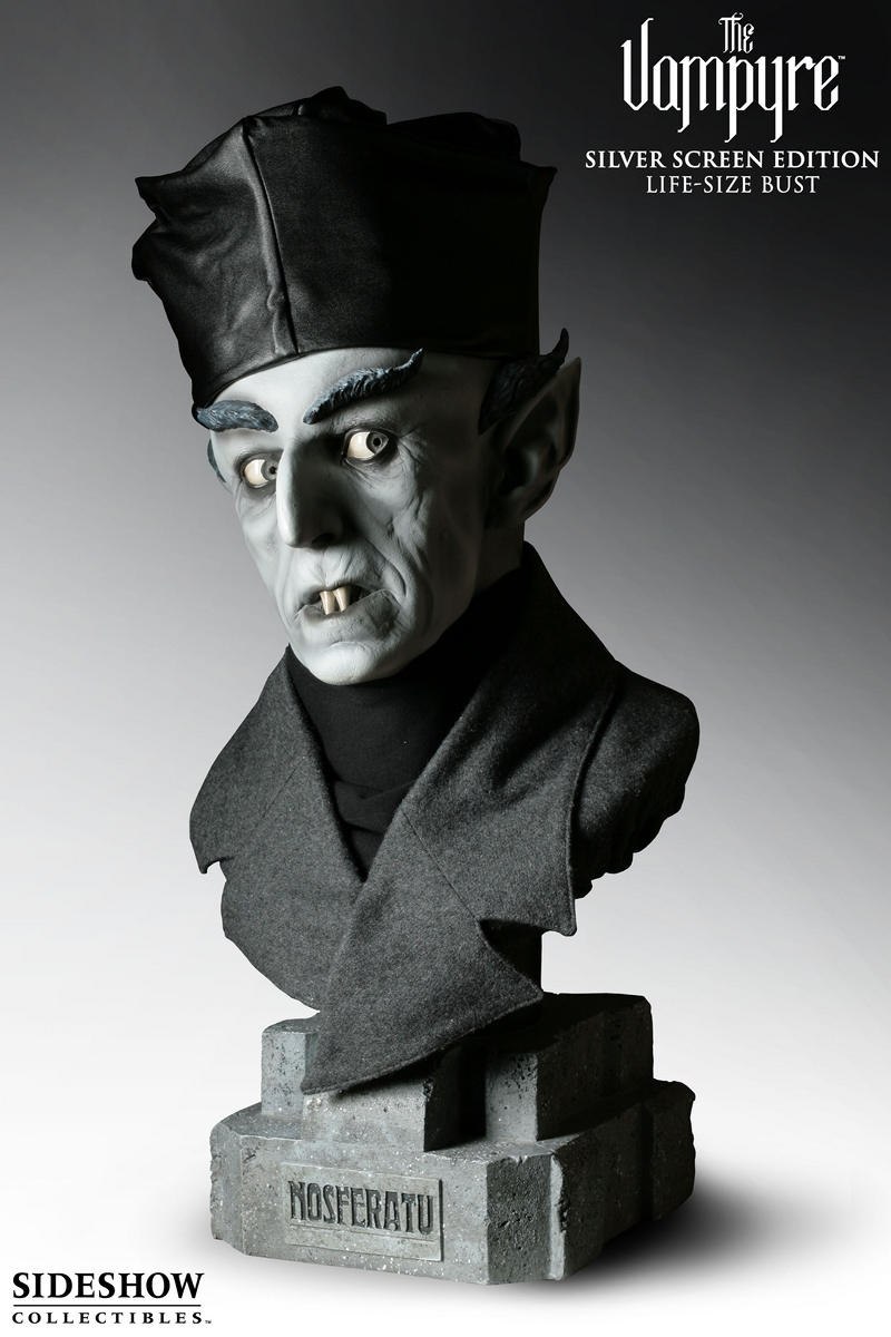 Sideshow Collectibles is proud to bring you the Silver Screen Edition Life-size bust of Max Schreck as Nosferatu. Every eerie wrinkle and furrow has been captured exactly in this frighteningly life-like portrait. The distinctive costuming has been reproduced in actual fabric, adding more life-like realism, including his hat. Each bust is hand cast in fiberglass, and hand finished to exacting standards. The figure is painted and costumed in grey-scale, true to his stunning original silver screen presence. The bust is mounted on a decorative base and each piece is individually hand-numbered.